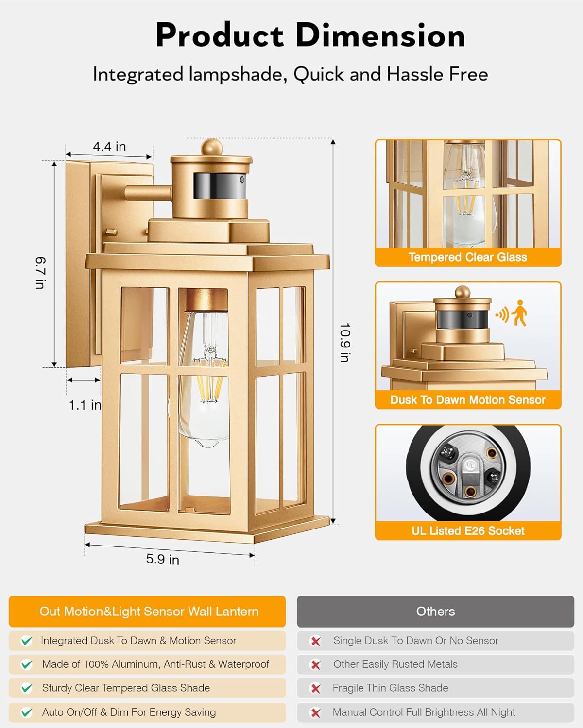 Gold Motion Sensor Outdoor Lights, Waterproof Exterior Lighting Fixtures, Aluminum Modern Outdoor Wall Lights Exterior, Transparent Glass Outdoor Porch Lights for House, Garden, Yard, E26 Base