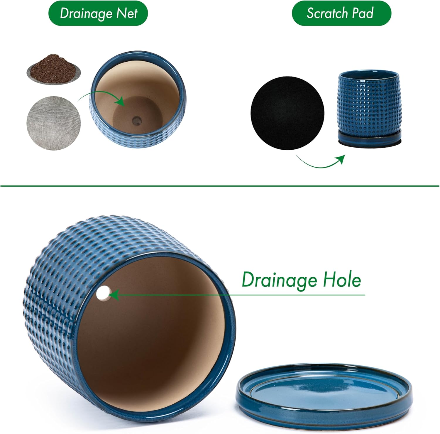 - >> Drainage Net and Pad - A stainless-steel drainage mesh net is also included to prevent soil from falling off the pot. Another protective pad is included to protect tabletop wood surface from scratches.