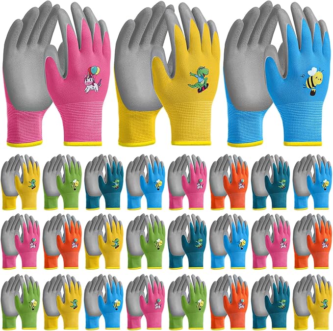 - Variety of Colors and Patterns: these kids gardening gloves offer a variety of colors and patterns including pink, green, blue, turquoise, yellow, and orange; Each pack comes with 24 gloves adorned with delightful designs like unicorns, bees, and crocodiles that make gardening more fun and exciting
