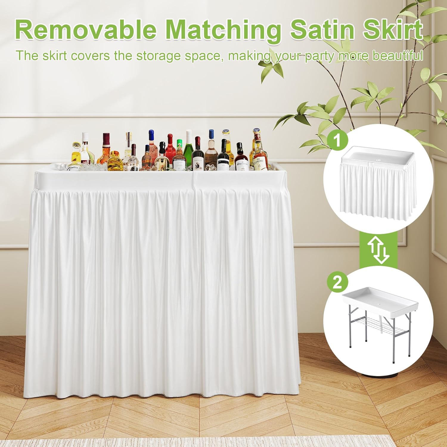 - Easy To Clean:The ice cooler table comes with a decorative skirt which adds elegance when displaying some drinks and fruits at an event. The matching skirt is removable and washable. Come with a drain hose which brings you much convenience to drain ice water inside the table top.
