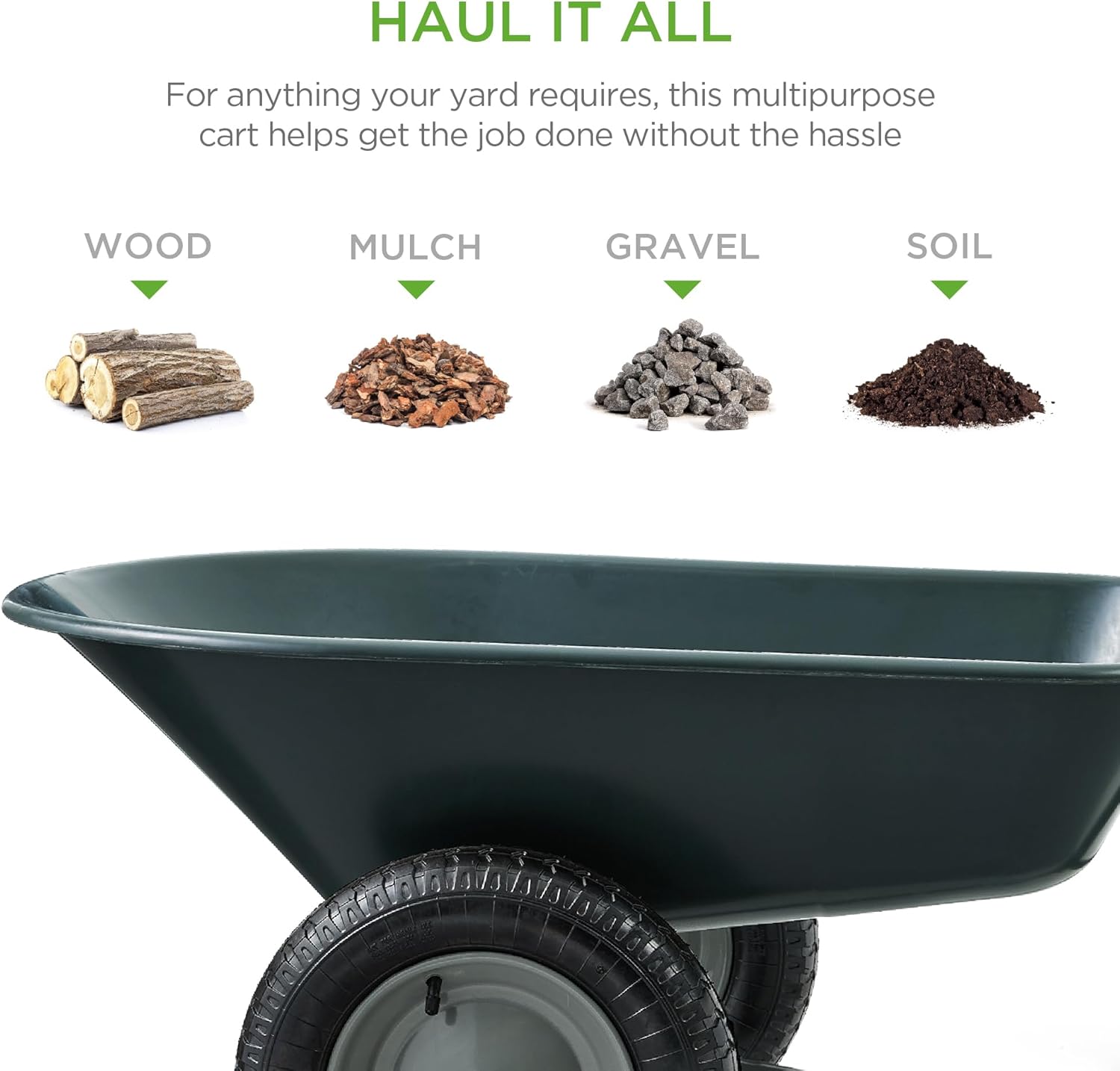 - MULTIPURPOSE GARDEN CART: Deep wheelbarrow holds up to 5 cubic feet of soil, bricks, mulch, gravel, and more, so you can conveniently carry out landscaping and other home improvement projects
