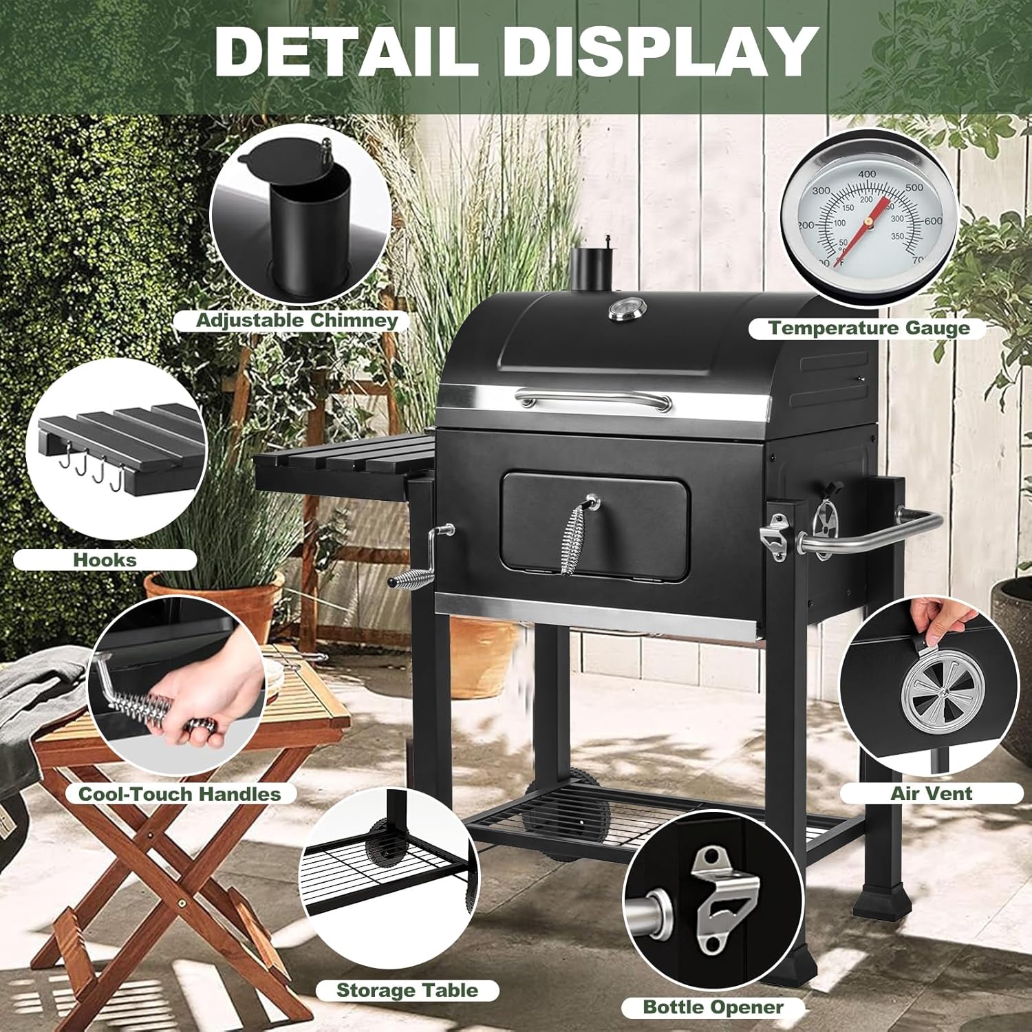 - Integrated Bottle Opener and Ventilation System: The built-in bottle opener adds a touch of convenience for parties and gatherings, while the top-mounted chimney and back vents ensure proper airflow, helping you maintain consistent heat and reducing flare-ups during longer grilling sessions.