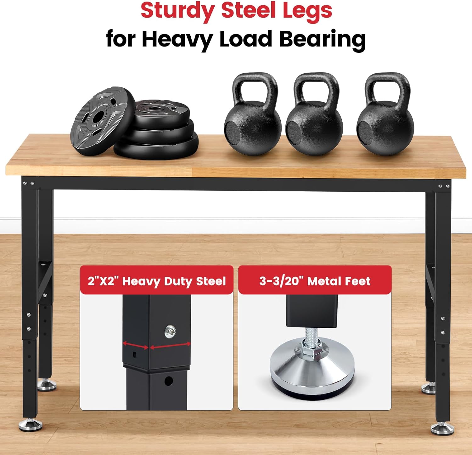 - Sturdy Steel Legs: H-shape frame with double crossbar support to enhance load bearing capacity. ②2x2" heavy duty steel legs ③1.2mm thickness steel ④3.15 inch diameter metal feet up to 2000lbs