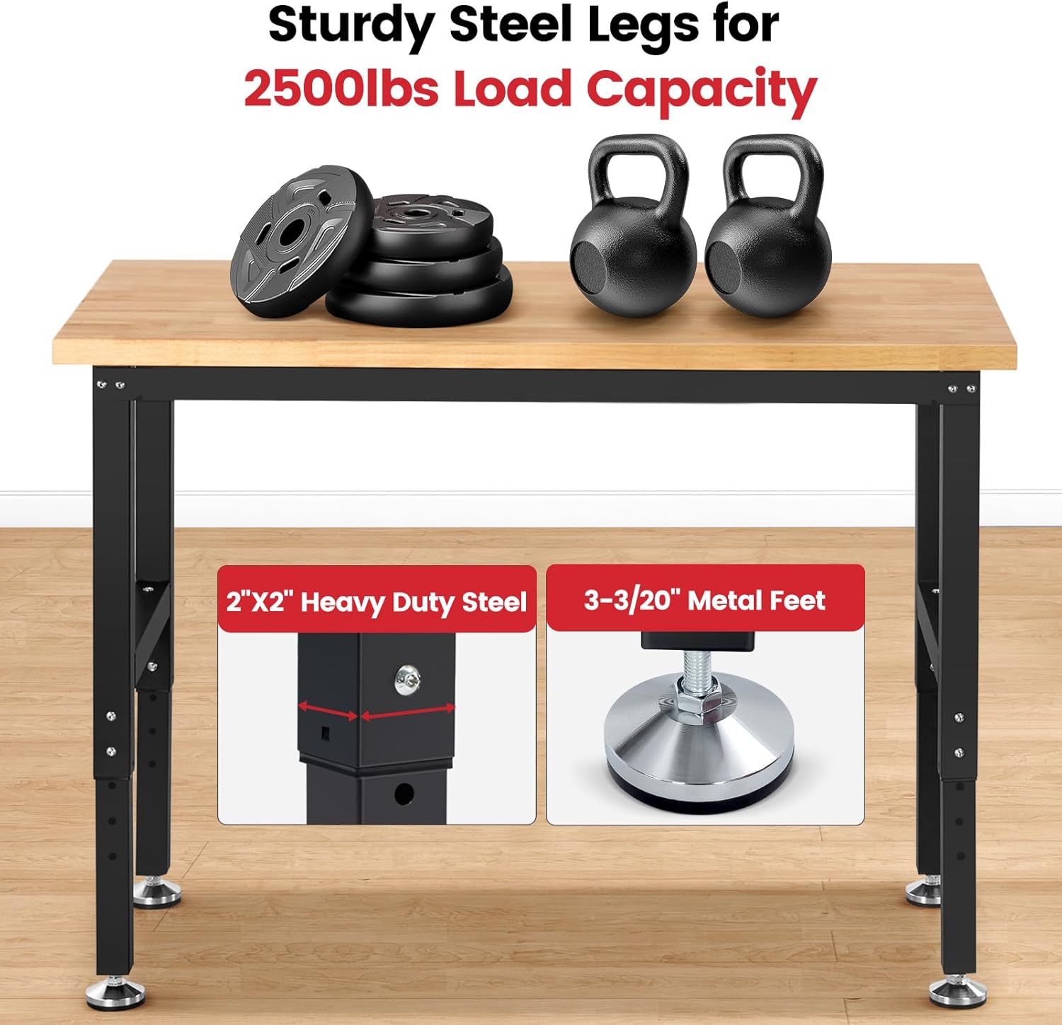 - Heavy Duty Rubberwood Tabletop: 1.2" solid rubberwood tabletop, with a weight capacity of 2500LBS, suits for heavy tools and materials. Comes with an safety varnish to protect the wood,workbench last longer.