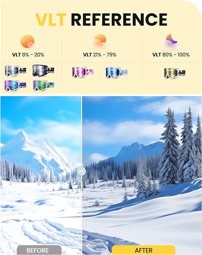 - Crystal Clear Vision: With special HD ski goggles, you will see everything clear and bright on the slopes! Kids snow goggles help cut down on glare and make sight looks sharp, so your eyes will not get tired. UV400 protects your eyes from the sun and keeps you safe while you have fun