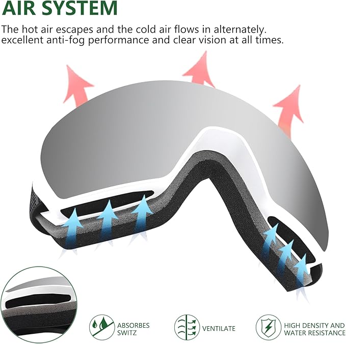 - Professional Ventilation :Our ski goggles two-way ventilation system is designed to reduce fogging and optimize air flow inside the lens;Snowboard goggles Gift for Christmas provide a smooth airflow system to quickly and effectively bring in fresh air and expel moisture when skiing, snowboarding, snowmobiling, alpine skiing