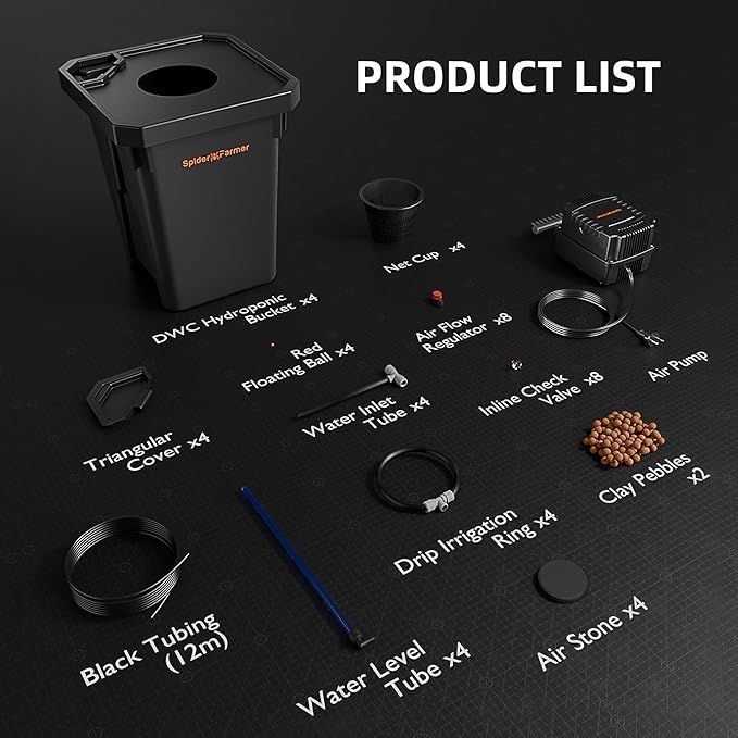 - ๐๐๐ ๐๐ฒ๐๐ซ๐จ๐ฉ๐จ๐ง๐ข๐๐ฌ ๐๐ฒ๐ฌ๐ญ๐๐ฆ ๐๐ข๐ญ ๐๐ง๐๐ฅ๐ฎ๐๐๐ฌ: 4pcs 7-gallon DWC Buckets, 4pcs triangular cover, 4pcs net cup, air pump, 4pcs air stone, 12M 4/6mm black tubing, dry clay pebbles, 4pcs water level tube, 4pcs drip irrigation ring, user manual and other accessories
