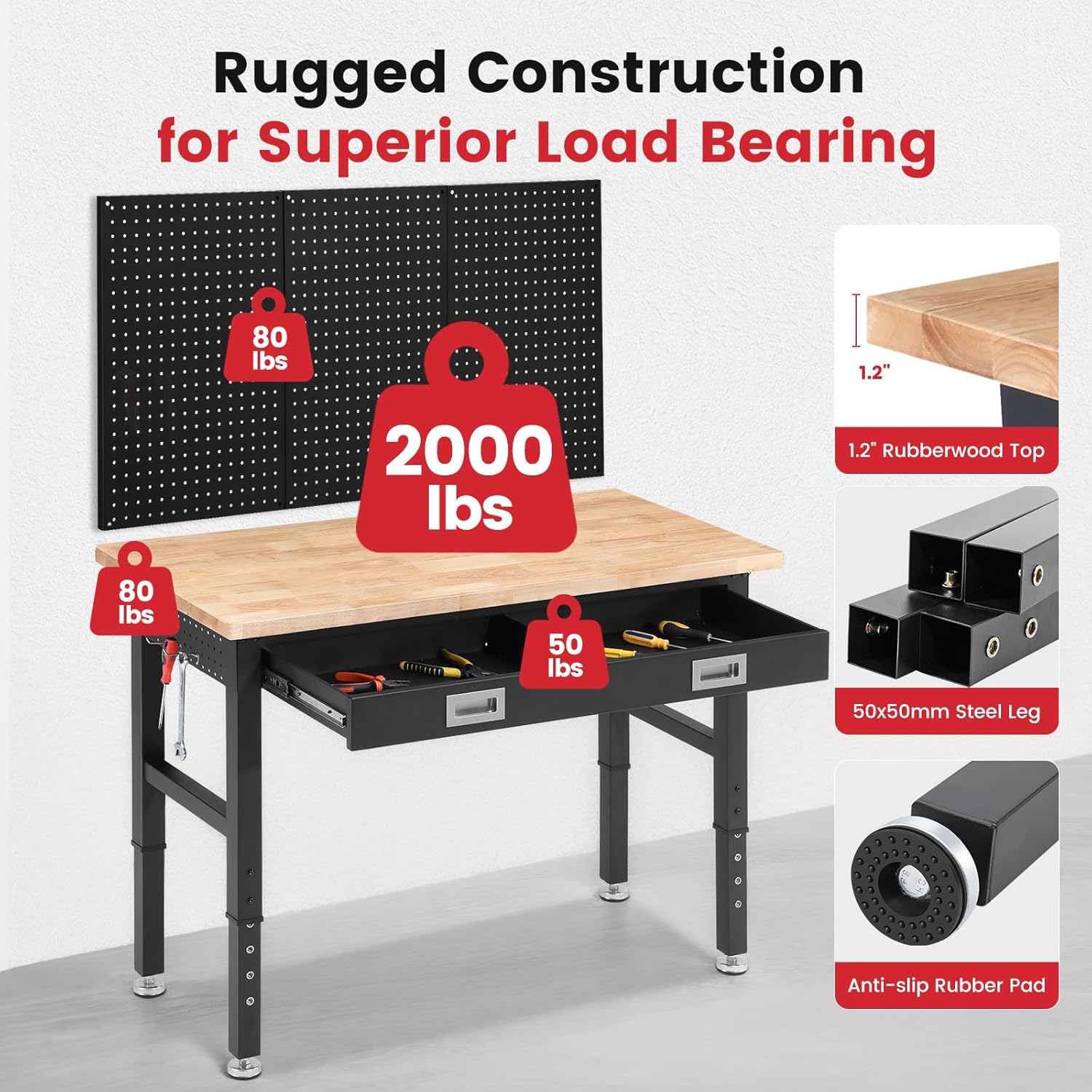 Work Bench with Storage Adjustable Workbenches with Drawer for Garage 48 Inch Rubber Wood Top Garage Workbench with Pegboard, Power Outlets for Woodworking,Home, Office, Workshop