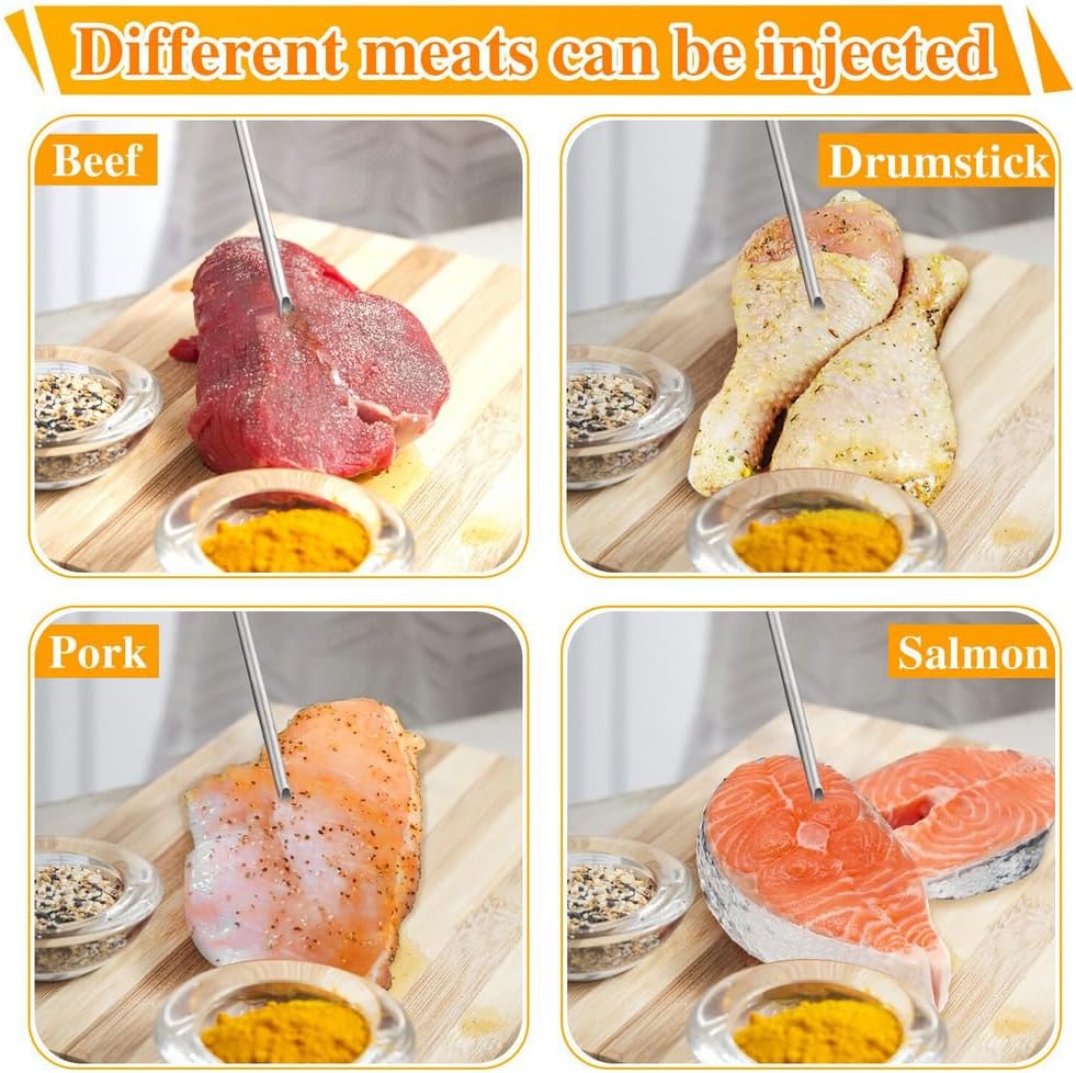 - Versatile Needle Options: This injector includes three specialized needles to suit all your seasoning needs: Side Hole Needle: Perfect for liquid marinades, allowing even distribution and deep penetration. Large End Hole Needle: Ideal for injecting minced garlic, onions, and other chunky ingredients. Short Needle: Designed for injecting smaller cuts like chicken, ensuring maximum flavor infusion.
