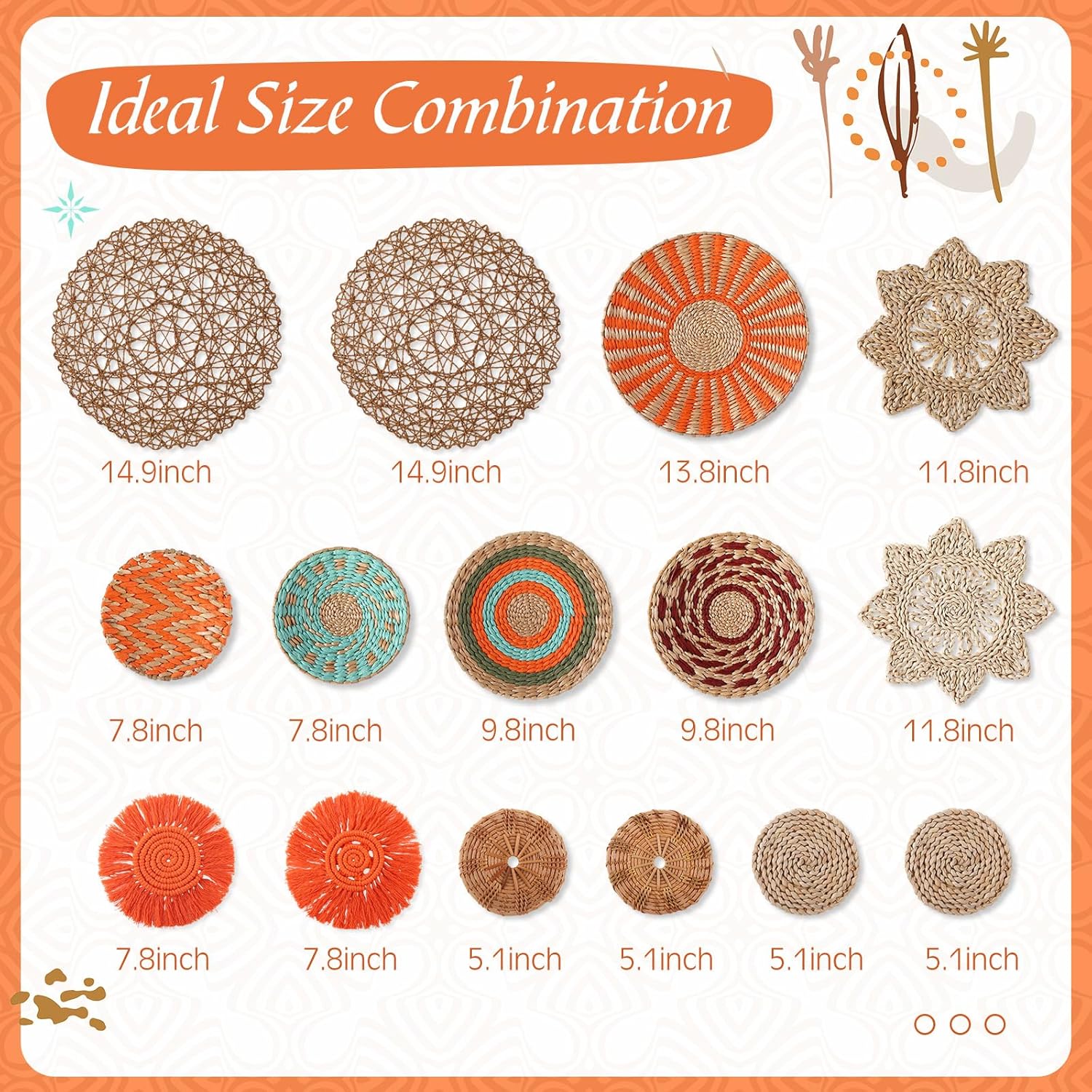 15 Pcs Boho Wall Basket Decor Woven Rattan Seagrass Wall Decor Hanging Rustic Farmhouse Western Art Decoration for Nursery Living Room Bedroom Home Kitchen(Orange Style)