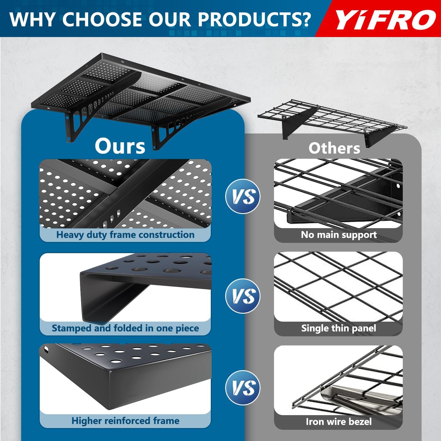 - HEAVY DUTY CONSTRUCTION: YIFRO garage wall shelving takes its cues from architectural frame construction, with a 2x3 ft individual bracket load capacity of 250 lbs. and a total of 500 lbs. for 2 shelves, which makes it easy to store most of the items in your garage.