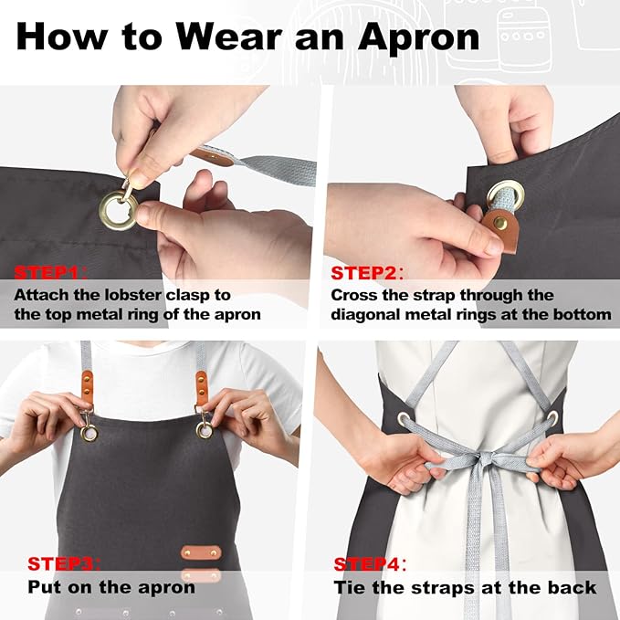 - Unique Cross-Back Design: Our apron features a cross-back strap design that reduces neck strain, unlike traditional aprons. With adjustable sizing, it fits both men and women of all body types comfortably. The detachable metal buckle allows for easy wearing and removal, and is also convenient for machine washing