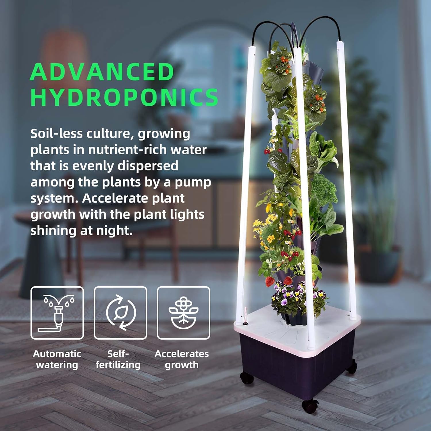 - Diversified Growing Options & Fast Harvest: you can grow all kinds of vegetables (lettuce, cucumber, mint), fruits (small tomatoes, strawberries), herbs and flowers at the same time. Fast growing and fresh ingredients can be harvested in a few weeks.
