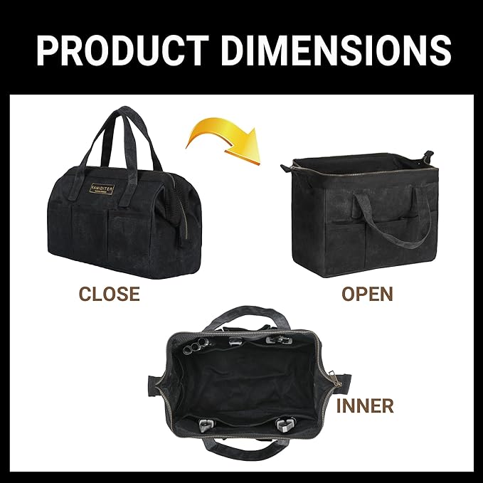 - PRODUCT DESIGN: This tool bag has 6 external pockets and 4 inner pockets, a large main compartment with internal steel reinforcement for maximizing the space on the top. It can help you organize your tools and easily identify them, saving space and time