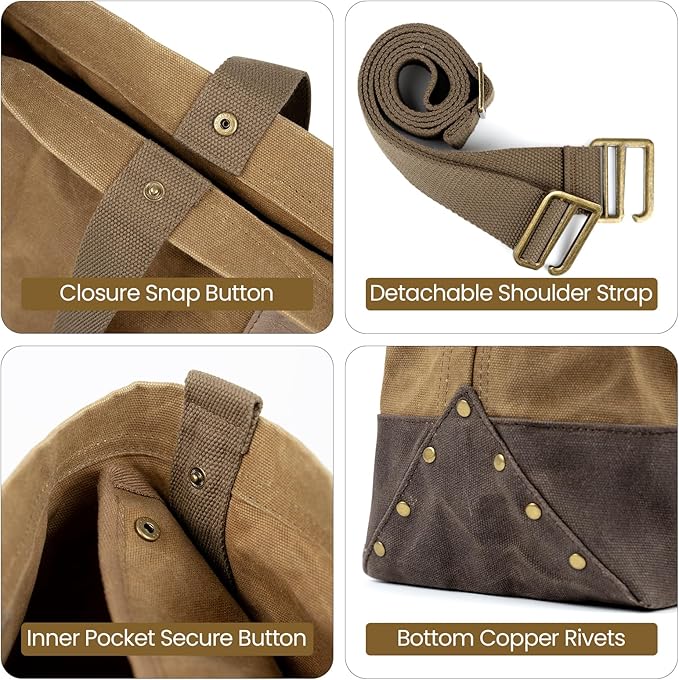 - Detachable & Adjustable Shoulder Strap: The OneTigris waxed canvas tool tote bag comes with a detachable and adjustable shoulder strap, accommodating various heights. You can easily adjust or remove the strap to suit your personal preferences for optimal comfort.It can be carried by hand, over one shoulder, or as a crossbody. The canvas tool bag is equipped with snap buttons on the handles, providing extra durability and allowing the opening to be easily secured, keeping items safely inside