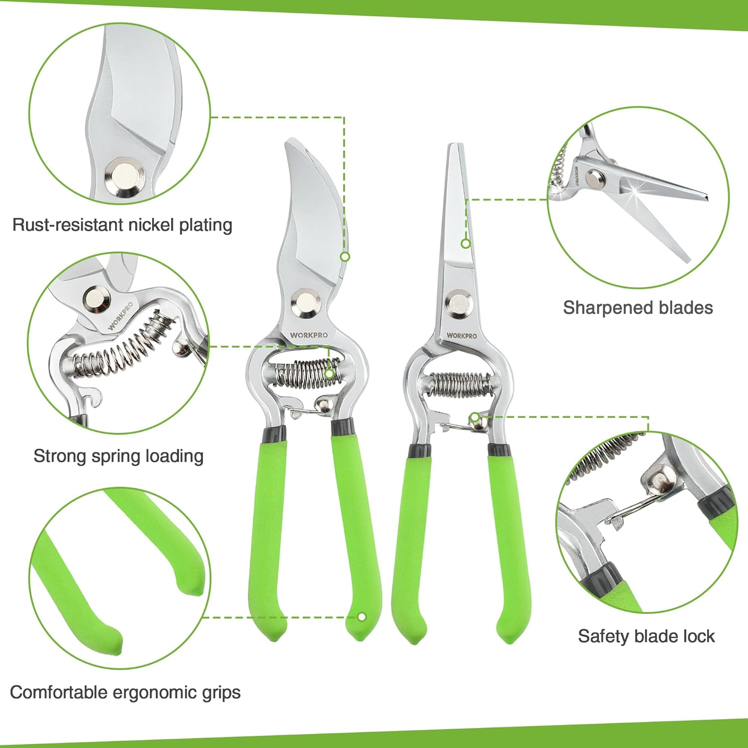 - Make Pruning Work Easier: The garden shears are equipped with sharp steel cutting blades and ergonomic handles. The spring helps you push the blades automatically, reducing hand fatigue. The locking mechanism between the handles keeps the blades closed when not in use