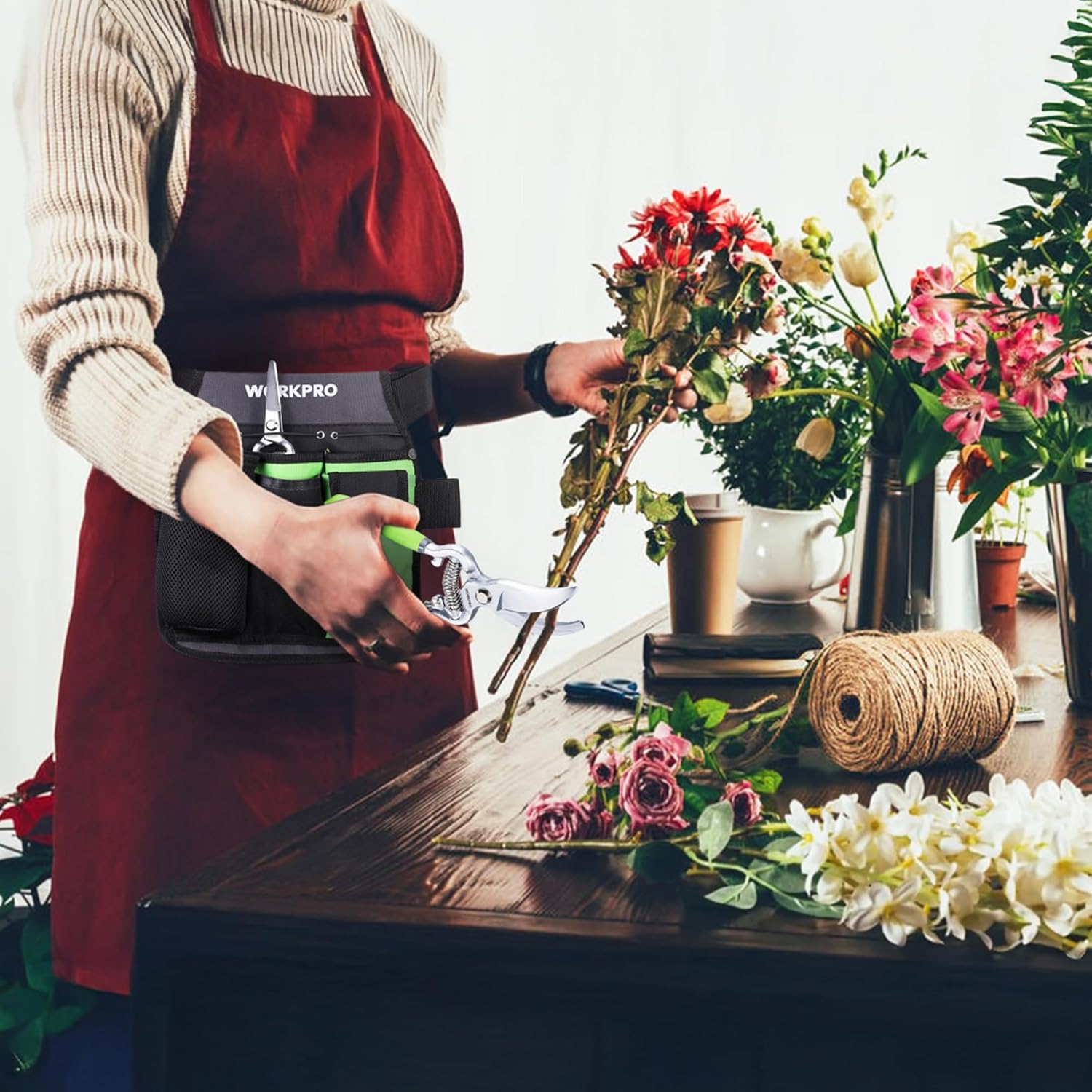 WORKPRO 2-Piece Pruning Shears and Garden Tool Belt Set, Gardening Belt with 5 Pockets and Adjustable Waist Belt, 8" Bypass Garden Shears and 8'' Handing Pruner with Steel Straight Blade