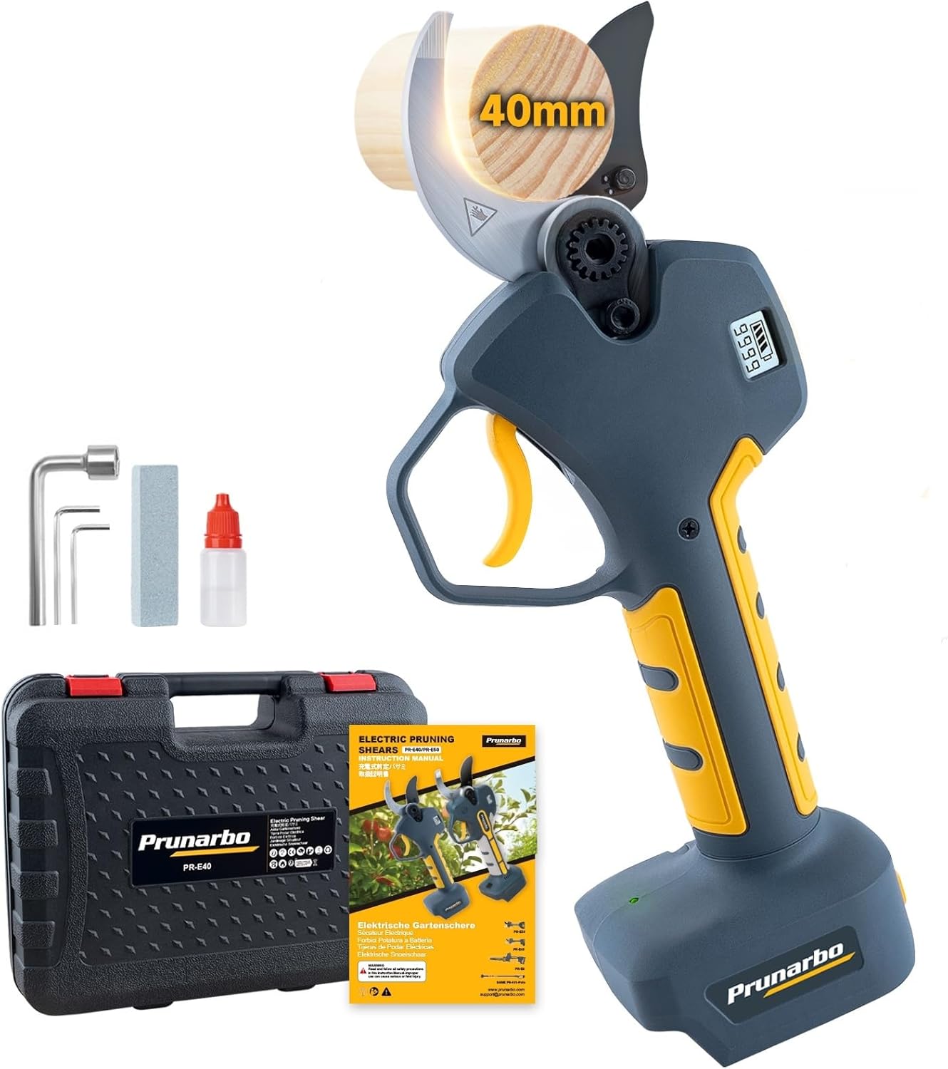 - 【Built in Safety Switch】Safety is a key feature of the Prunarbo's electric pruners cordless. With a built-in safety lock, you need to press the switch twice quickly before use to prevent accidents. The power pruner will enters “standby” mode and stop working if 60 seconds without cutting. And it will enter "auto turn off" mode after 15mins when not in sue. Then you need to restart it if you want to prune again.