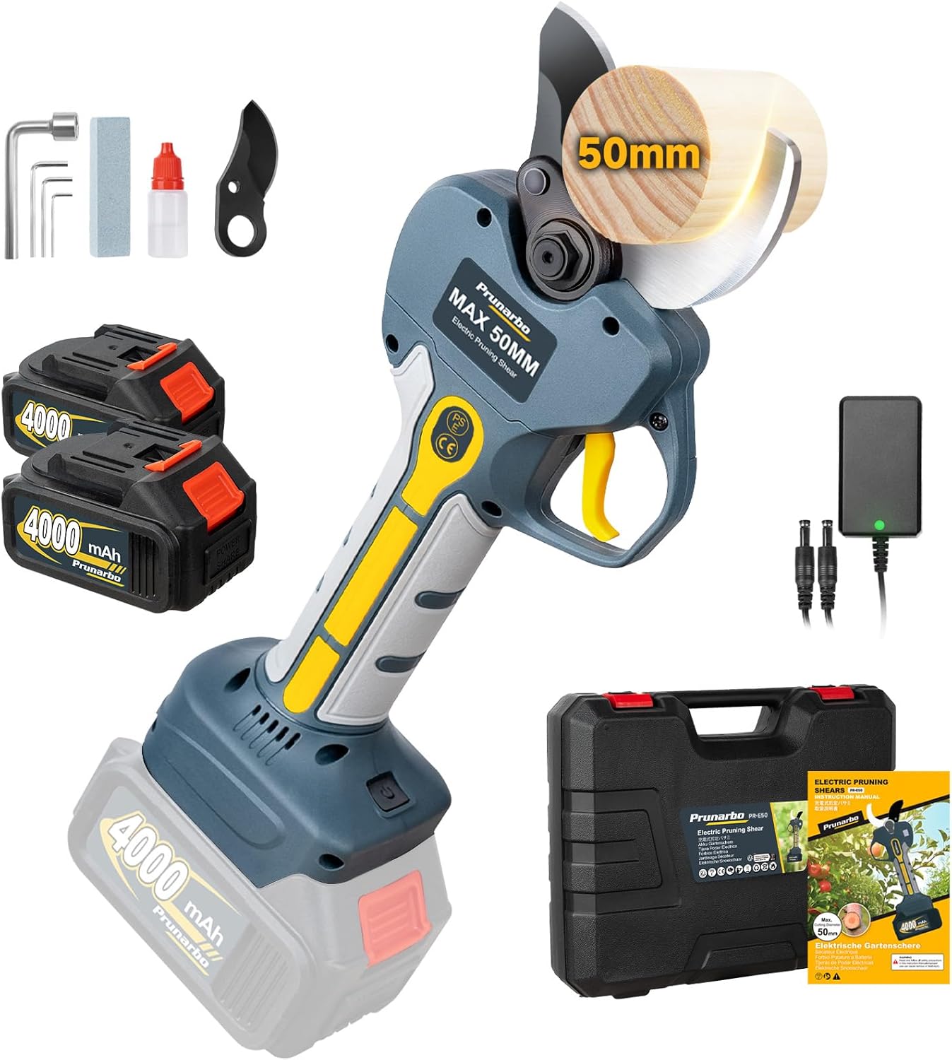 - 【Prunes 5CM Branches in a Single Clean Cut】Prunarbo battery pruning shears can effortlessly tackle branches of 50mm diameters in just 0.8 second. Also, PR-E50 professional electric pruning shear provides customizable cutting options with 30mm and 50mm diameter settings. The cordless pruning shears deliver fast and ensure a clean-cut for healthier plants. It is specifically designed for professional orchardists to effortless prune oak, maple, cedar and fruit trees like citrus, apple, cherry, peach, grape.