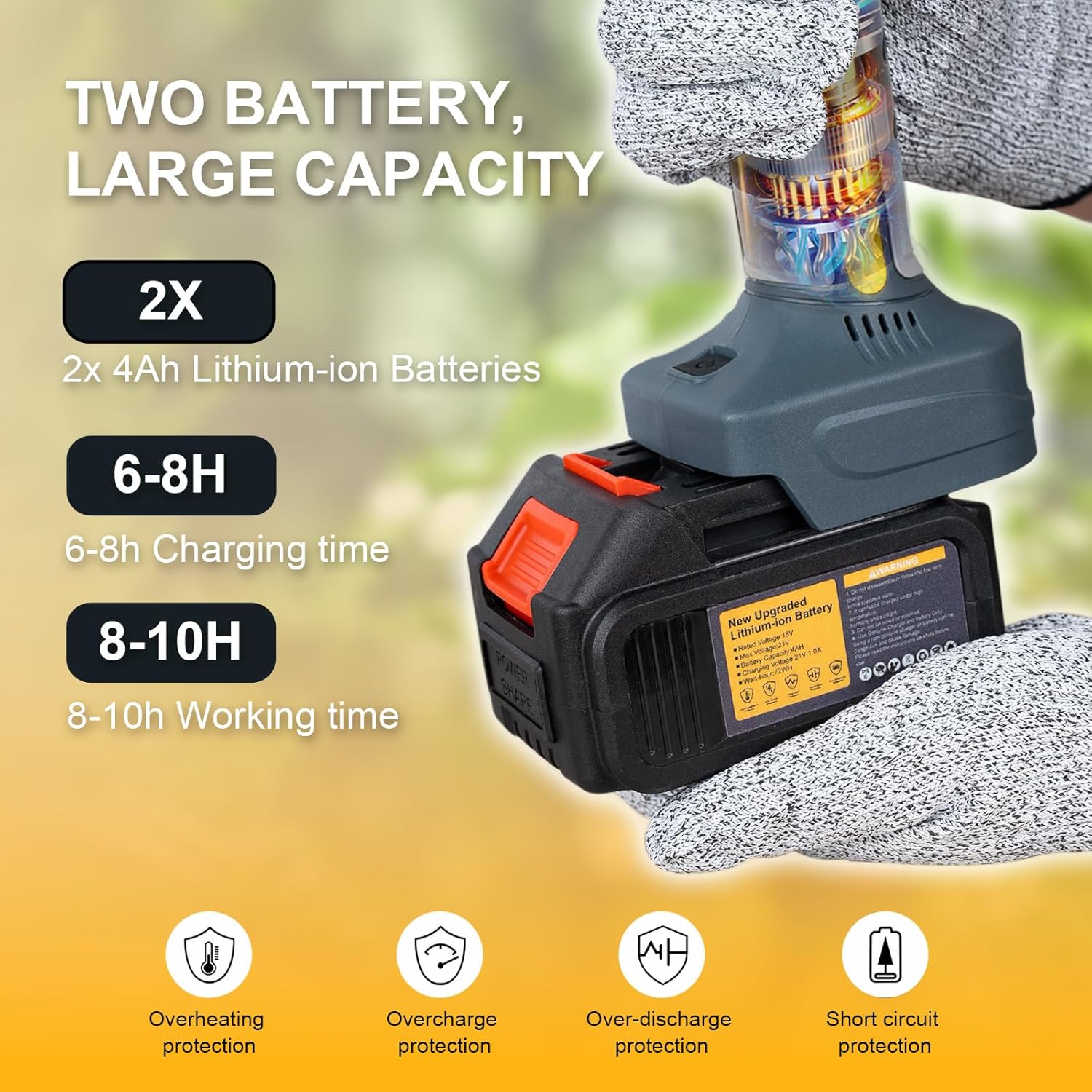- 【8000mAh Battery & Compatible with Makita】Our cordless pruner shear is equipped with 2 * 4000mAh batteries. Two batteries can support you 8-10 hours of pruning work! The superior battery capacity compared to the other product in the market is higher. Also, Our tree pruner is compatible with Makita battery. It provides convenience and better experience for people who owns Makita 18V battery.