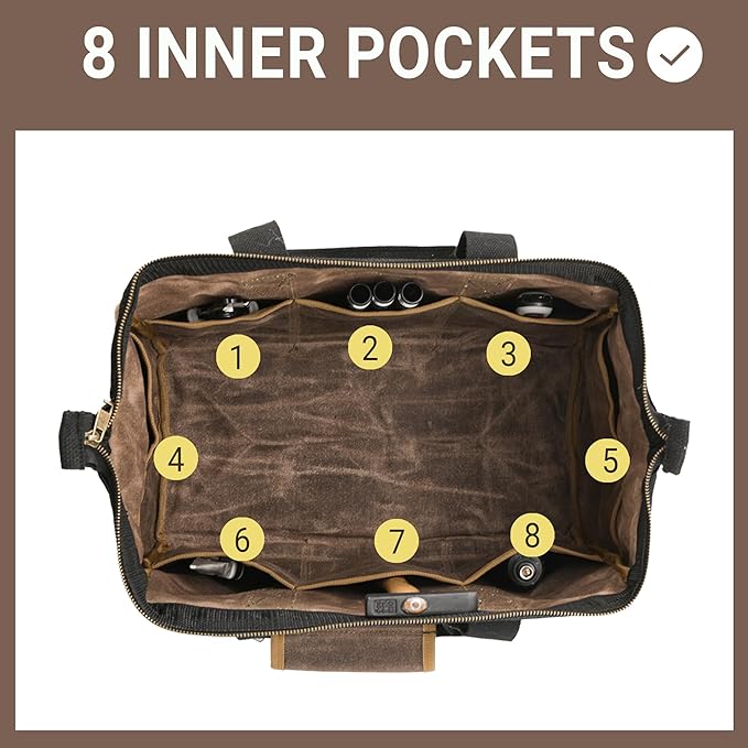 - PRODUCT DESIGN: This tool bag has 6 external pockets and 8 inner pockets, a large main compartment with internal steel reinforcement for maximizing the space on the top. It can help you organize your tools and easily identify them, saving space and time