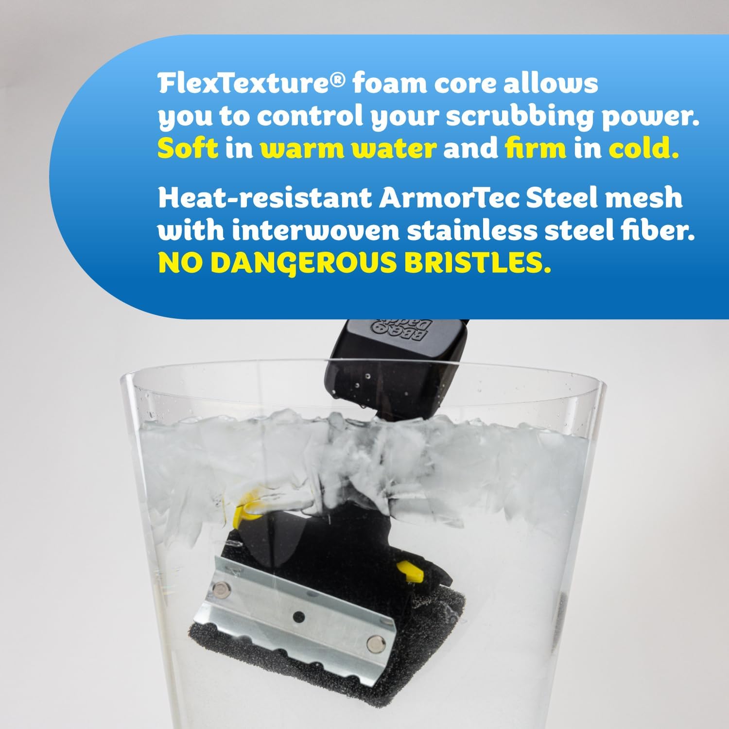 - BBQ Daddy - BBQ Daddy is a bristle free grill brush with a unique, high-tech scrubbing head made of FlexTexture foam. When dipped in cold water, its core will firm up. Then, as you scrub, steam from the grill will boost your cleaning power and the grill cleaner will gradually soften to reach deep into the grates.