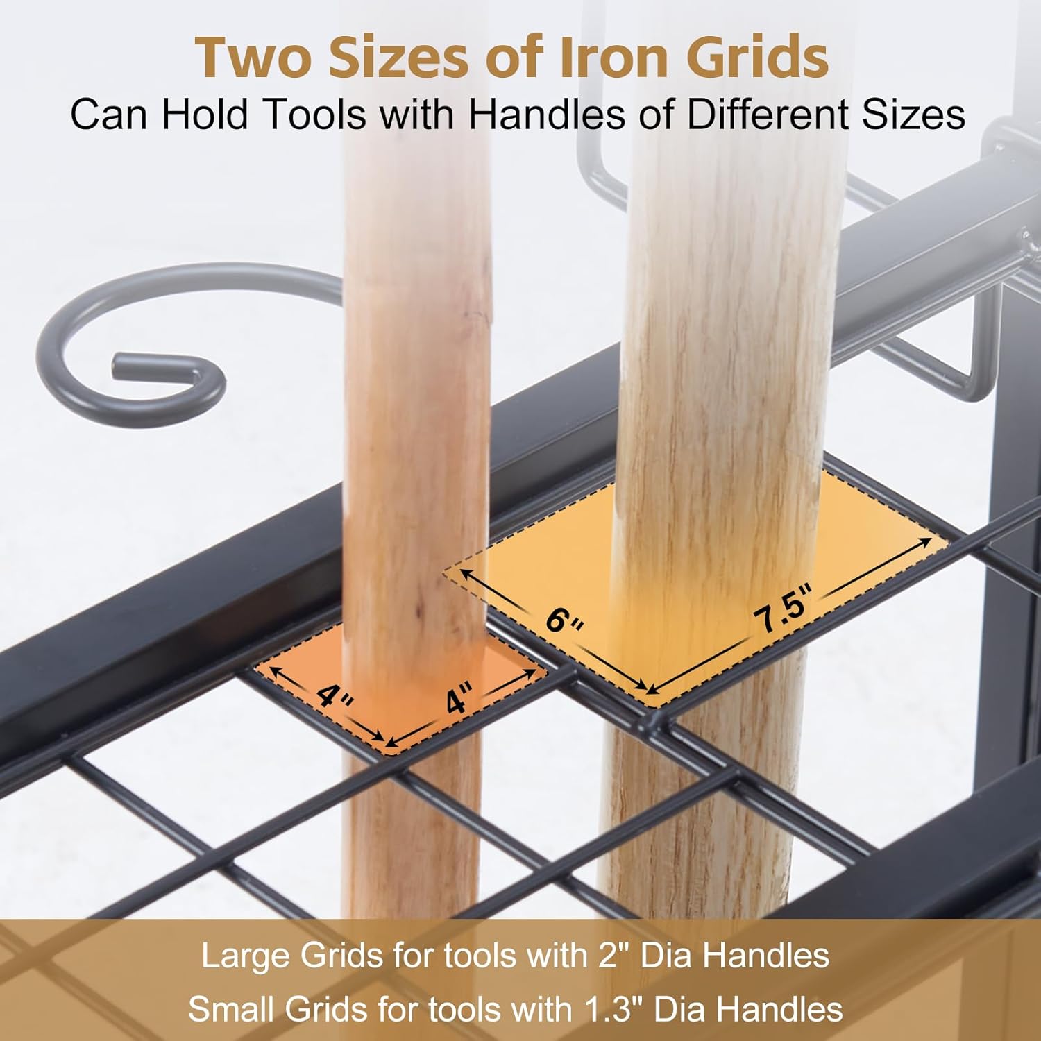 - WARM TIP: Our garage garden organizer is perfect for long-handled toolsbut not suitable for large power tools or irregularly shaped tools. The large grid is suitable for tools with a handle diameter of 2'', and the small grid is suitable for tools with a handle diameter of 1.2'', Considering the nature of gardening tools, which often have one end larger than the other, we do not recommend filling all the grids with tools