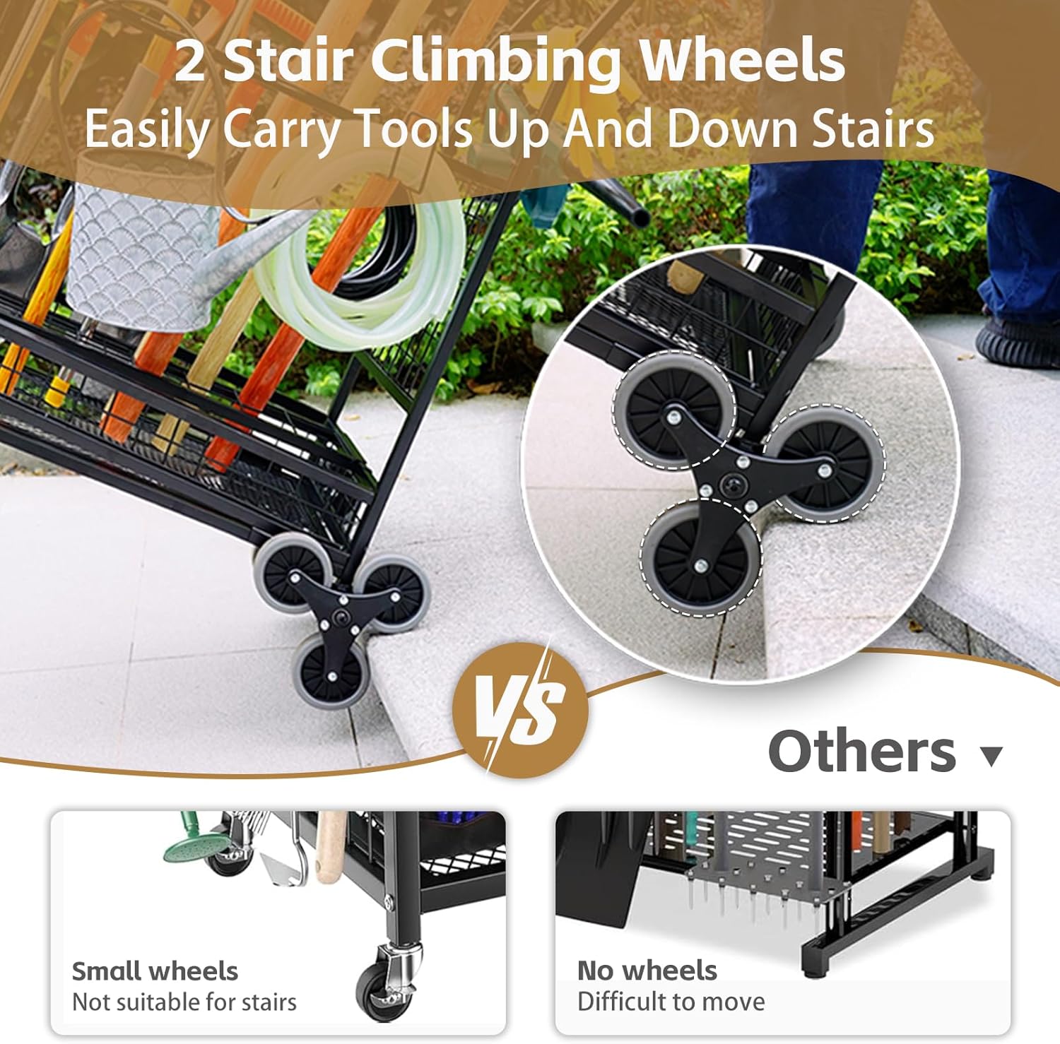 - Designed for Ultimate Convenience: Our garden tool cart with wheels has 2 stair climbing wheels and 2 lockable wheels, making it easy to transport all your tools to the yard or wherever you need them in one trip. The stair climbing wheels provide extra convenience where there are steps, allowing you to move the tool rack between yards, driveways and gardens with less effort