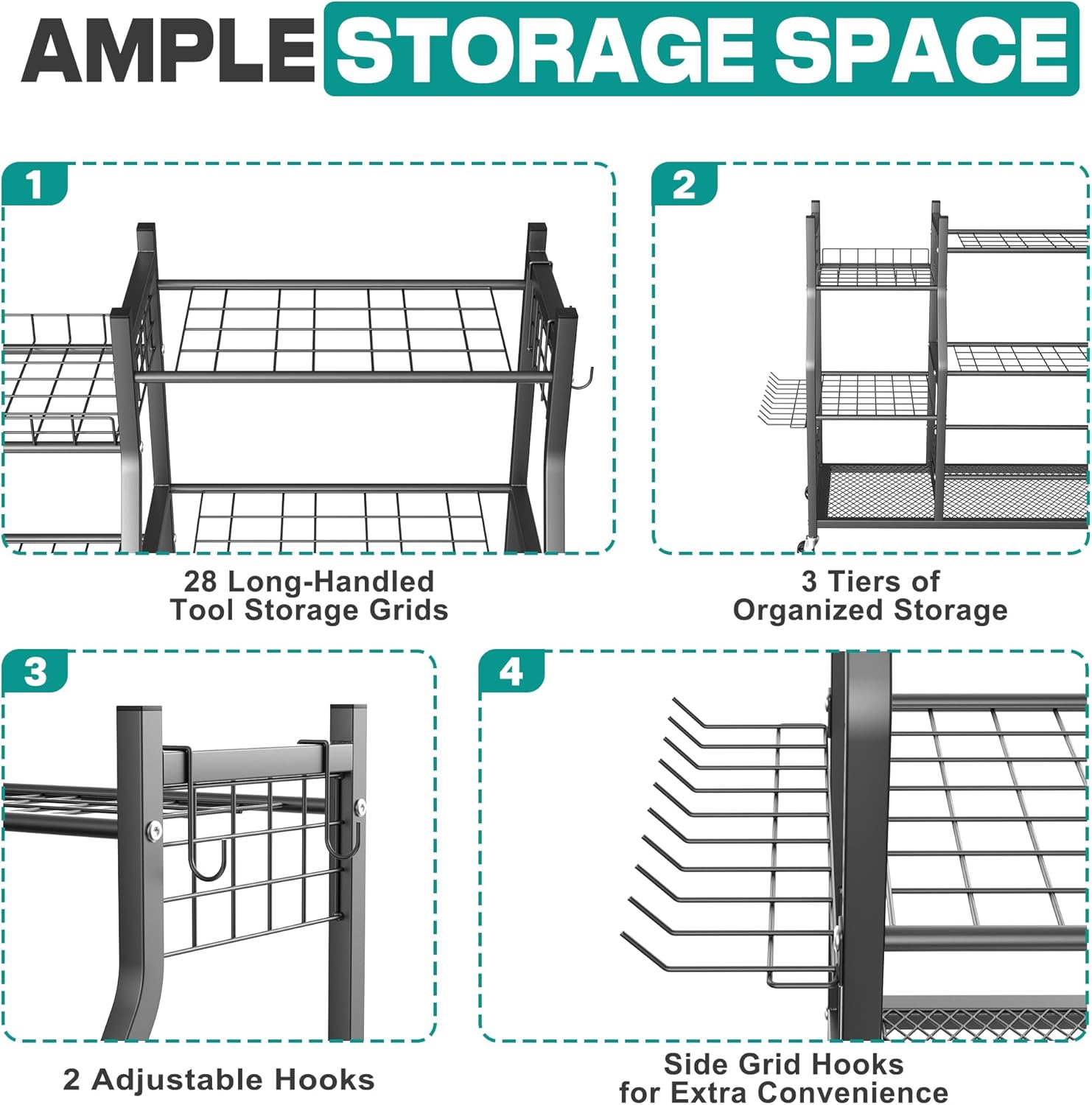 - Flexible Movement & Locking: Equipped with four heavy-duty wheels, this garden tool stand moves easily on uneven ground or grass. Two wheels feature a locking function to secure the rack in place when needed