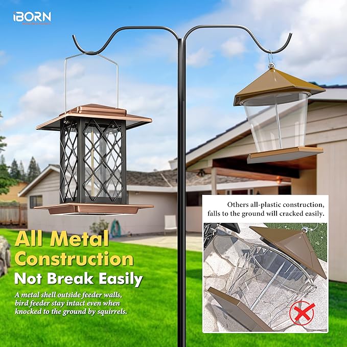 - Heavy Duty Metal Bird Feeder, Not Easy to Break: Except for the metal roof and perches, the iBorn bird feeder has a metal shell outside feeder walls. This is why our bird feeder weigh twice as much as other plastic bird feeders. In the event of outdoor bad weather, even if the bird feeder is accidentally dropped, it will not be easily broken. More durable, longer lasting. iBorn bird feeder is a fantastic addition to any outdoor space!