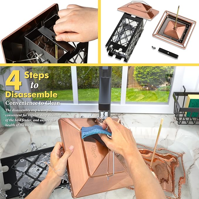 - Easy Disassembling, Cleaning Deeply: iBorn wild bird feeder can be disassembled rapidly in 4 steps without using any other tools. Convenient for you to complete regular thorough cleaning. Cleaner bird feeders, Cleaner seeds!