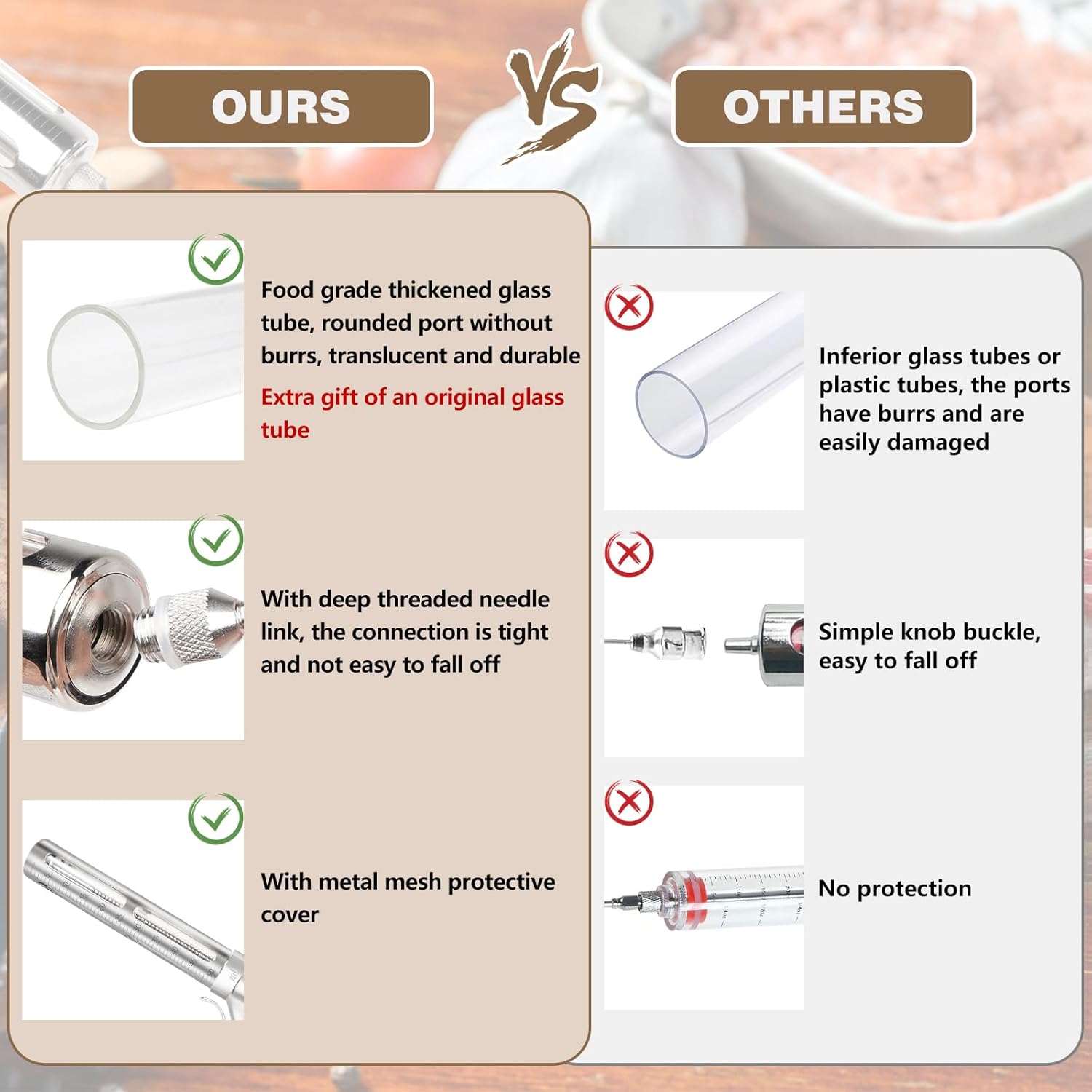 - Leak-Proof, Durable Design – Crafted with a thickened, food-grade stainless steel needle and upgraded, burr-free glass tube. Ensures tight connections and a smooth, leak-proof marinade injection every time, preventing spills and over-injection.