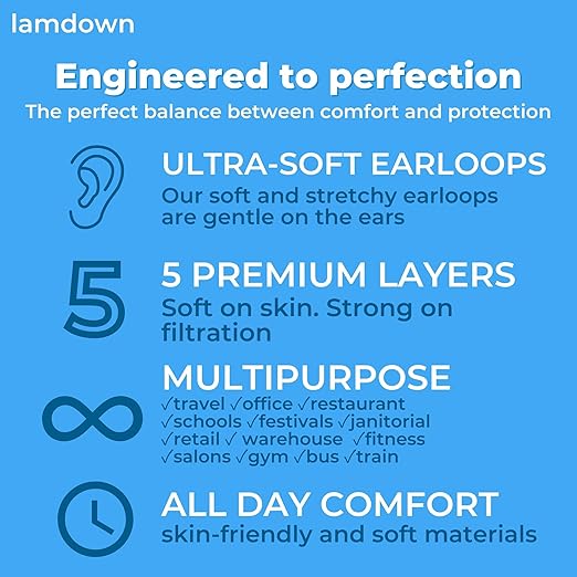 - 5‑Layer Superior Protection: Lamdown KN95 masks feature two non‑woven outer layers, two high‑efficiency melt‑blown filters, and a soft hot‑air cotton inner layer. This advanced design delivers ≥ 95% filtration of fine particles, offering greater protection than standard 3‑ply masks..