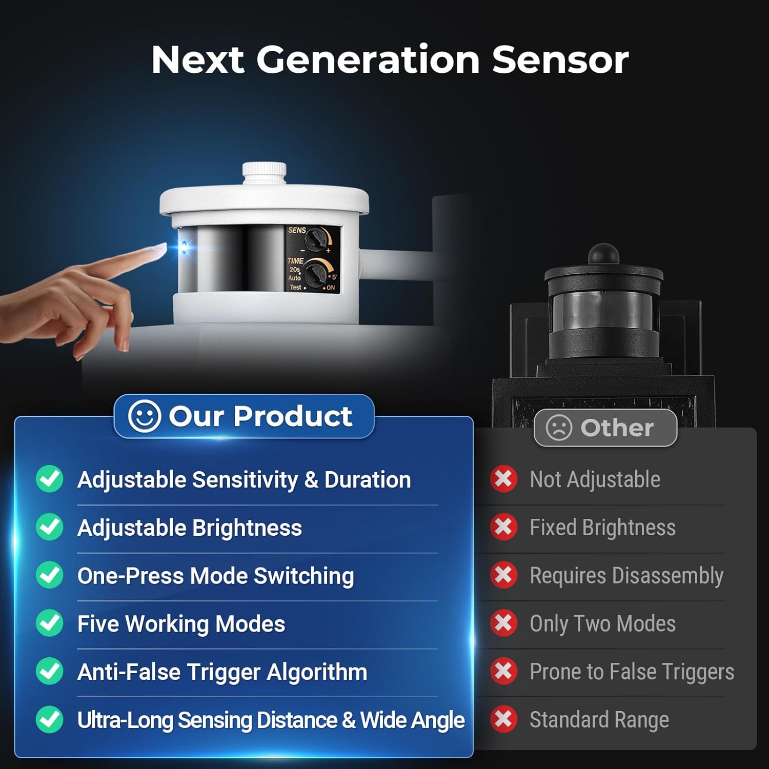 - [5 Lighting Modes] Giving your lights unlimited possible! ①DIM and ECO+ Mode: 100% light once motion is detected(DIM keep 30% brightness on night while ECO+ MODE keep off on night). ② D2D Mode: Automatically turn on throughout the night and off during the day, with motion detection disabled. ③ Override Mode: 100% On for 8 hours. Then resume previous working mode. ④ On Mode: It will be controlled solely by your light switch for turning on and off with all sensor functions disabled.