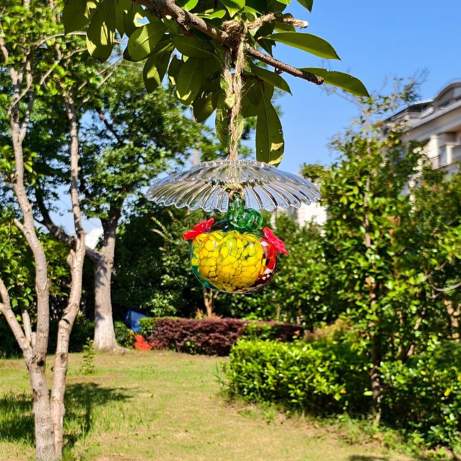 Small Glass Hummingbird Feeders for Outdoors Hanging + Rain Cover - Hand Blown Glass Pumpkin Nectar Feeding, 2 Flowers Feeding Ports, Decor for Garden/Backyard Outside, Multi Color