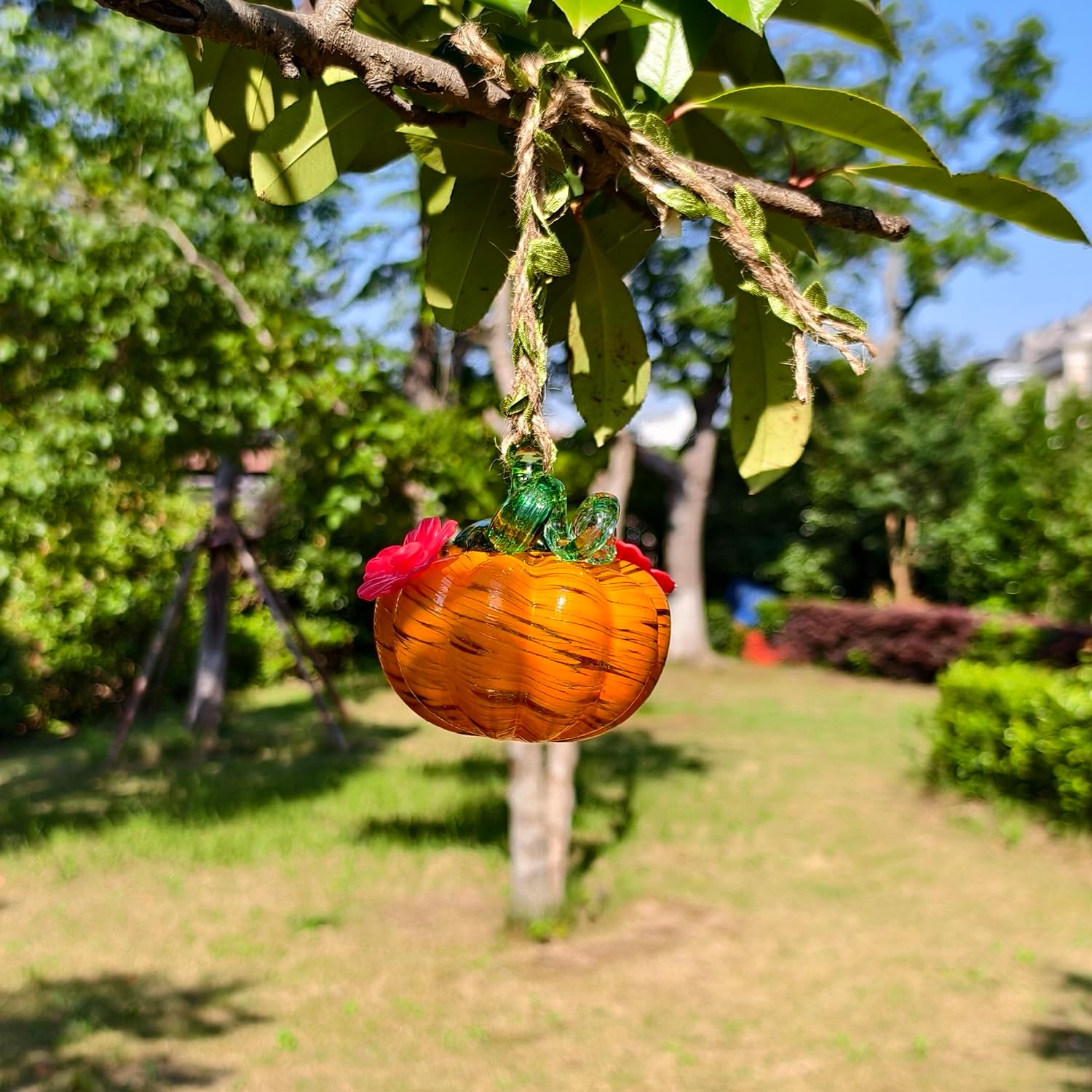 Small Glass Hummingbird Feeders for Outdoors Hanging - Hand Blown Glass Pumpkin Nectar Feeding, Orange Yellow with 2 Flowers Feeding Ports, Decor for Garden/Backyard Outside