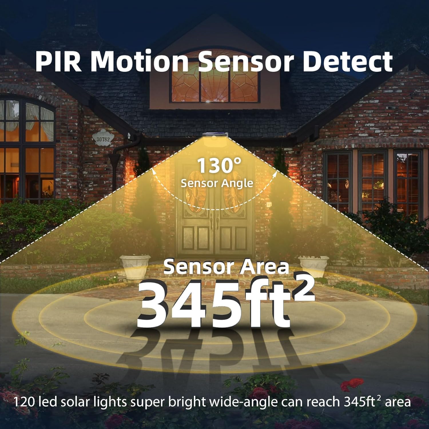 HMCITY 120 LED Outdoor Solar Lights- with Motion Sensor and 3 Lighting Modes, IP65 Waterproof Wide Solar Wall Lights Ideal for Garden Patio Yard (Front Button 4Packs, Warm White)