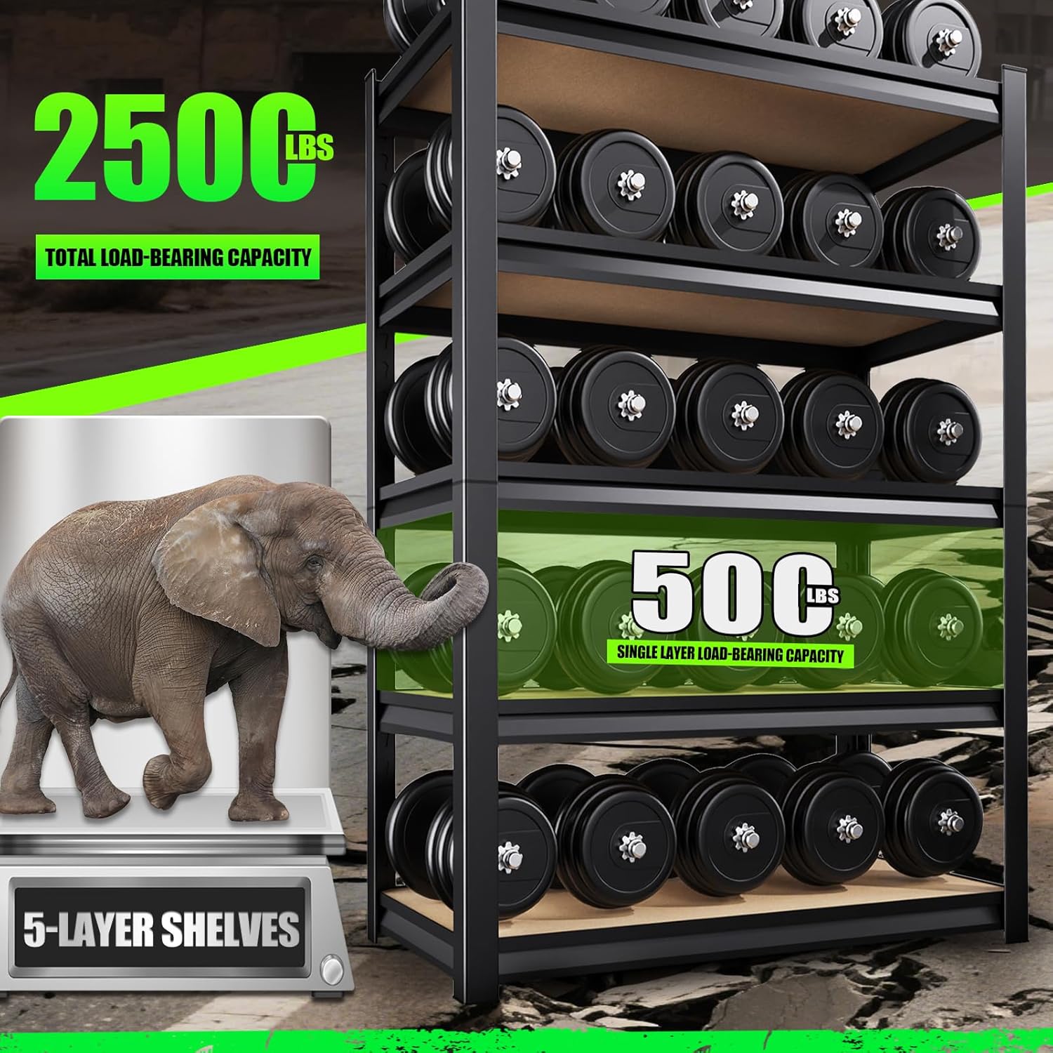 - 【Double Layer Column Design】Garage storage shelves are designed with double layer high strength steel columns, made of high quality steel metal frame + high density wood boards. It has more stable load bearing capacity than other single tier racks on the market. Each wood shelf is with support ribs to ensure that the garage shelving will not bend or deform even if each partition is loaded with 500 pounds, double guarantee, so you can store your things with peace of mind.