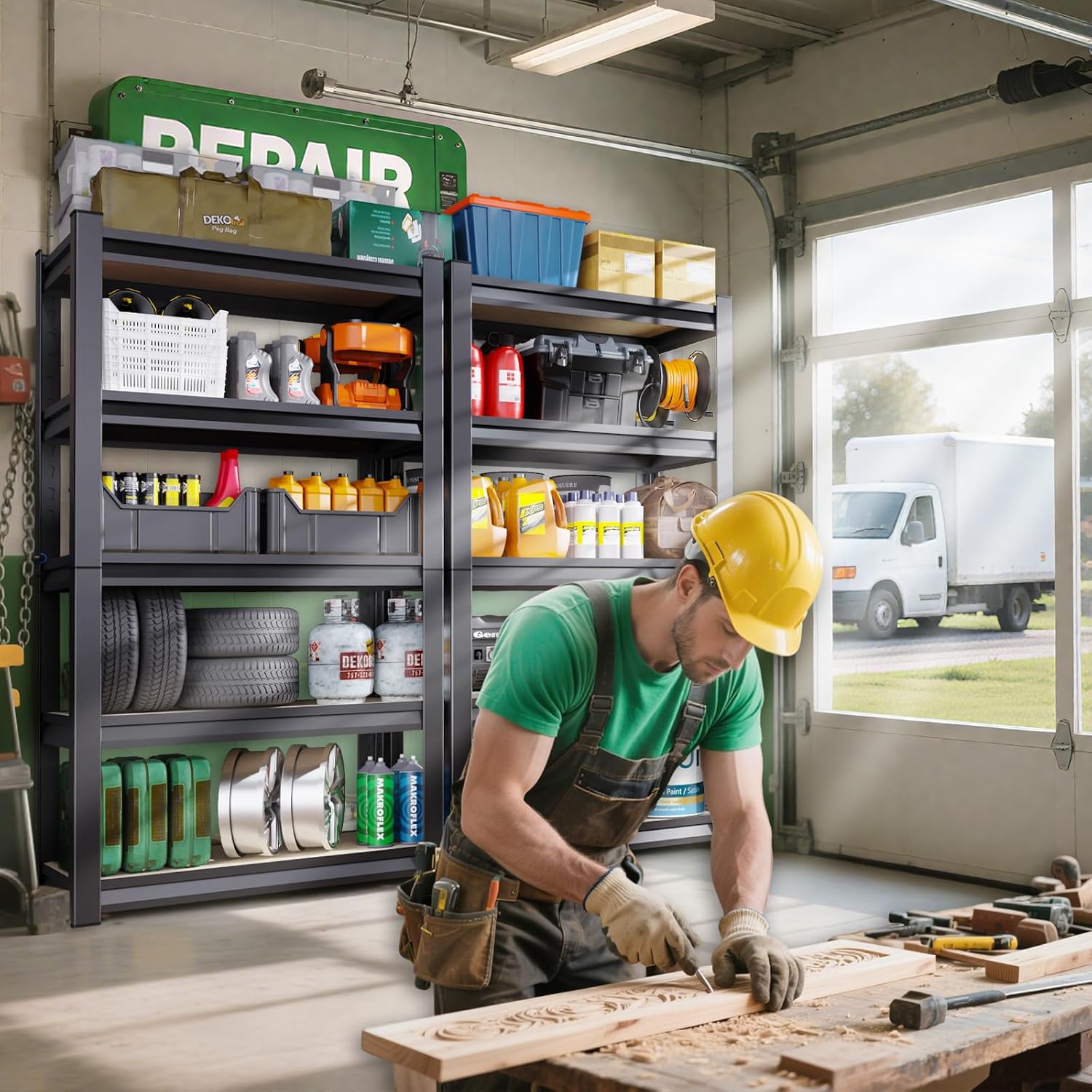 - ⑤Powerful Storage Capacity--Multi-functional shelves are designed for ultimate space tidiness. If you are still troubled by how to organize your cluttered garage and which old items to shed, garage storage shelves help you easily regain a neat and orderly home environment. Not only do the shelf expand your storage space for a clean and aesthetically pleasing environment, but the open space allows you to find items at a glance.