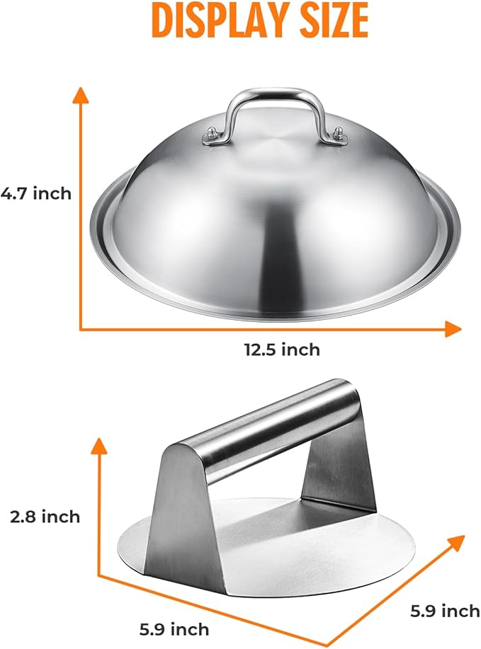 - 【Top Quality And Superior Material】The basting cover is 2.5mm thick 304 stainless steel and heavy duty, It’s durable and easy to clean. The griddle press is made with steel smash and the handle is solidly installed. Both of pro griddle accessories for Blackstone are perfect for longer use.
