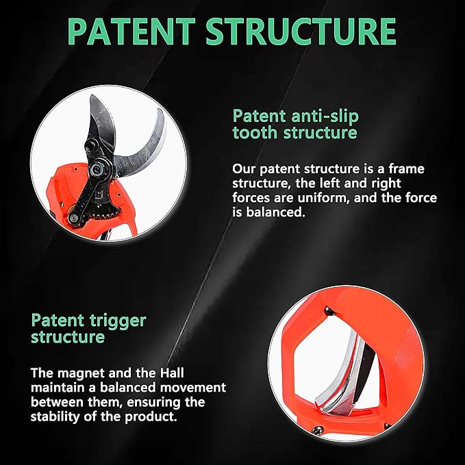 - 🛠️ 【Patented Anti-Slip Gear and Track Trigger – Built for Durability】 Featuring a patented anti-slip gear system and track-style trigger, our electric pruning shear can withstand up to 300,000 cuts without any slippage, offering durability far beyond standard models that usually wear out after 100,000 cuts.