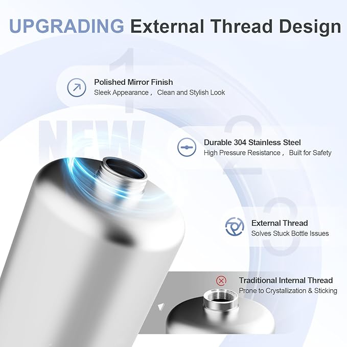 - Upgraded 304 Stainless Steel Bottle with External Thread. Made from food-grade 304 stainless steel, now 50% thicker for enhanced durability. The 2.5L bottle holds 200–300g of material, and the 5L holds 600–800g. External thread design prevents the bottle from getting stuck due to residue buildup. High-pressure resistant with a mirror-polished finish—built for both safety and aesthetics.