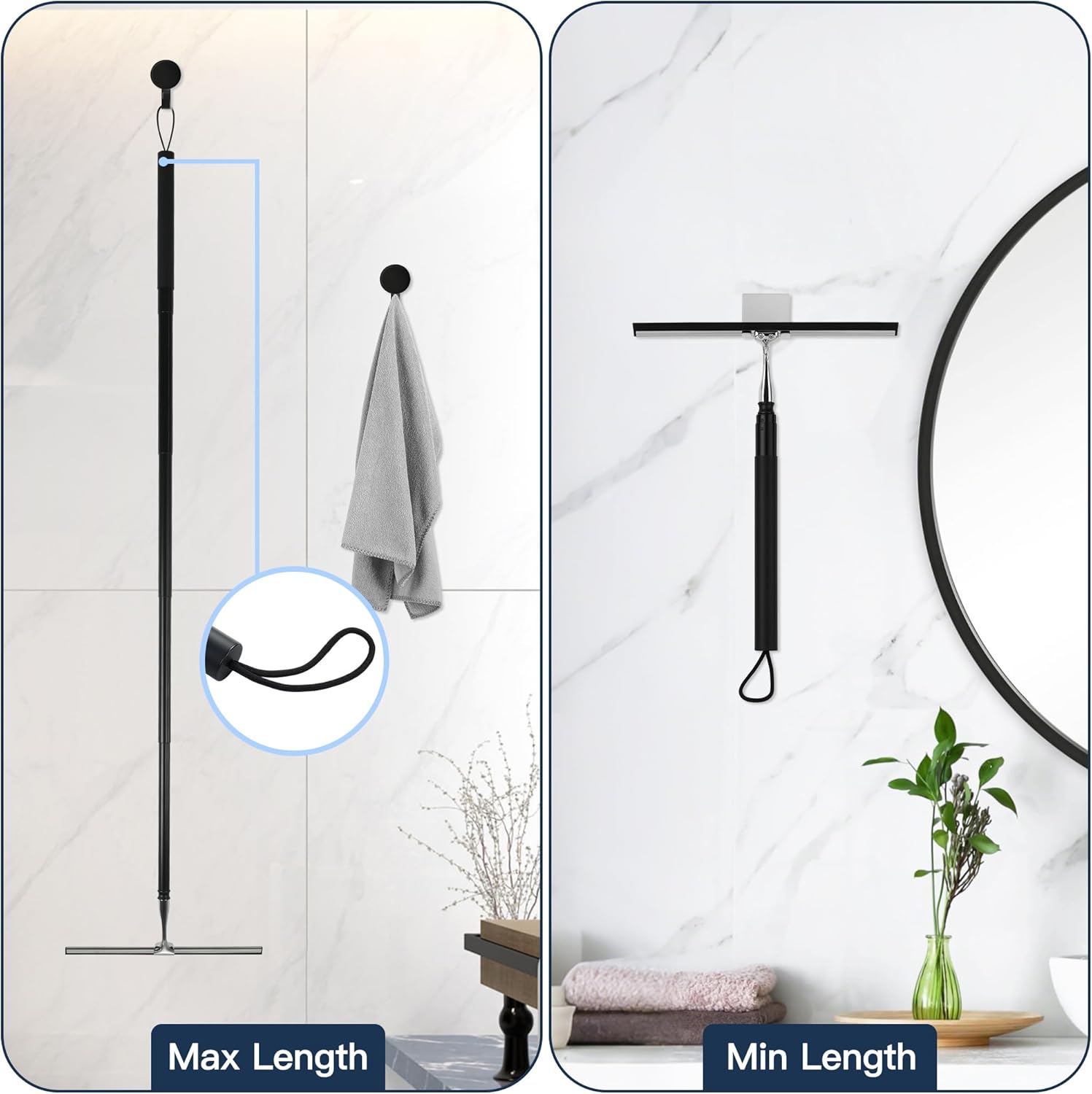 - 51’’ Telescopic Design Handle: This squeegee features a telescopic and ergonomic handle, easily adjusted from 14.96’’ to 50.79’’ to accommodate windows of varying heights, especially for hard-to-reach areas. This allows you to clean low areas without bending over. No assembly required. The handle is thickened and anti-slip, providing a comfortable grip even for extended periods.