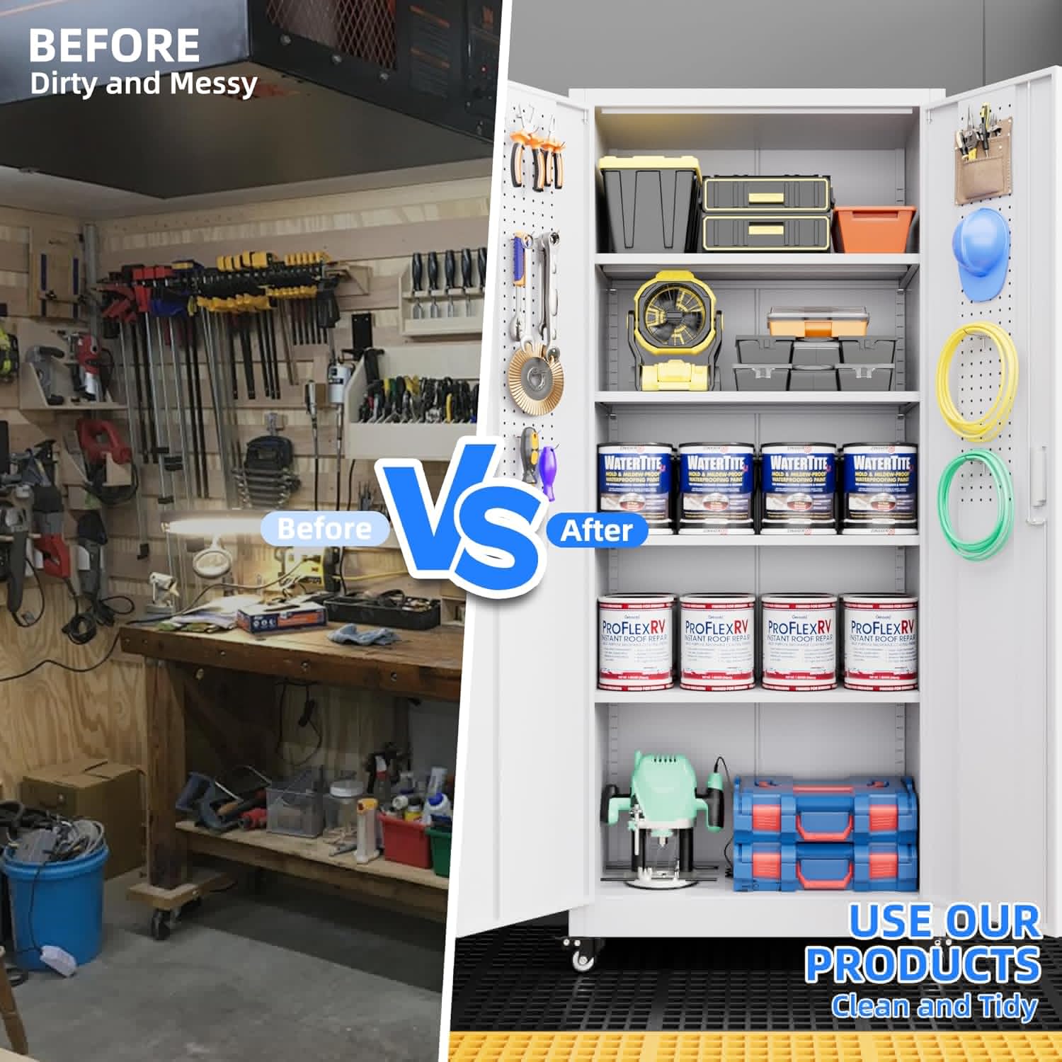 - ăUtility Pegboard & Adjustable Shelves ăRedesign your organizing ways, hang up everything on the door, get effortless accessible for a variety of small hardware, no more searching for things among the clutter. Tall Garage storage cabinet with wheels is designed with 4 adjustable shelves, you can easily meet your different storage needs by adjusting the height between the shelves.Each shelf of the storage cabinet on wheels can hold up to 150lbs