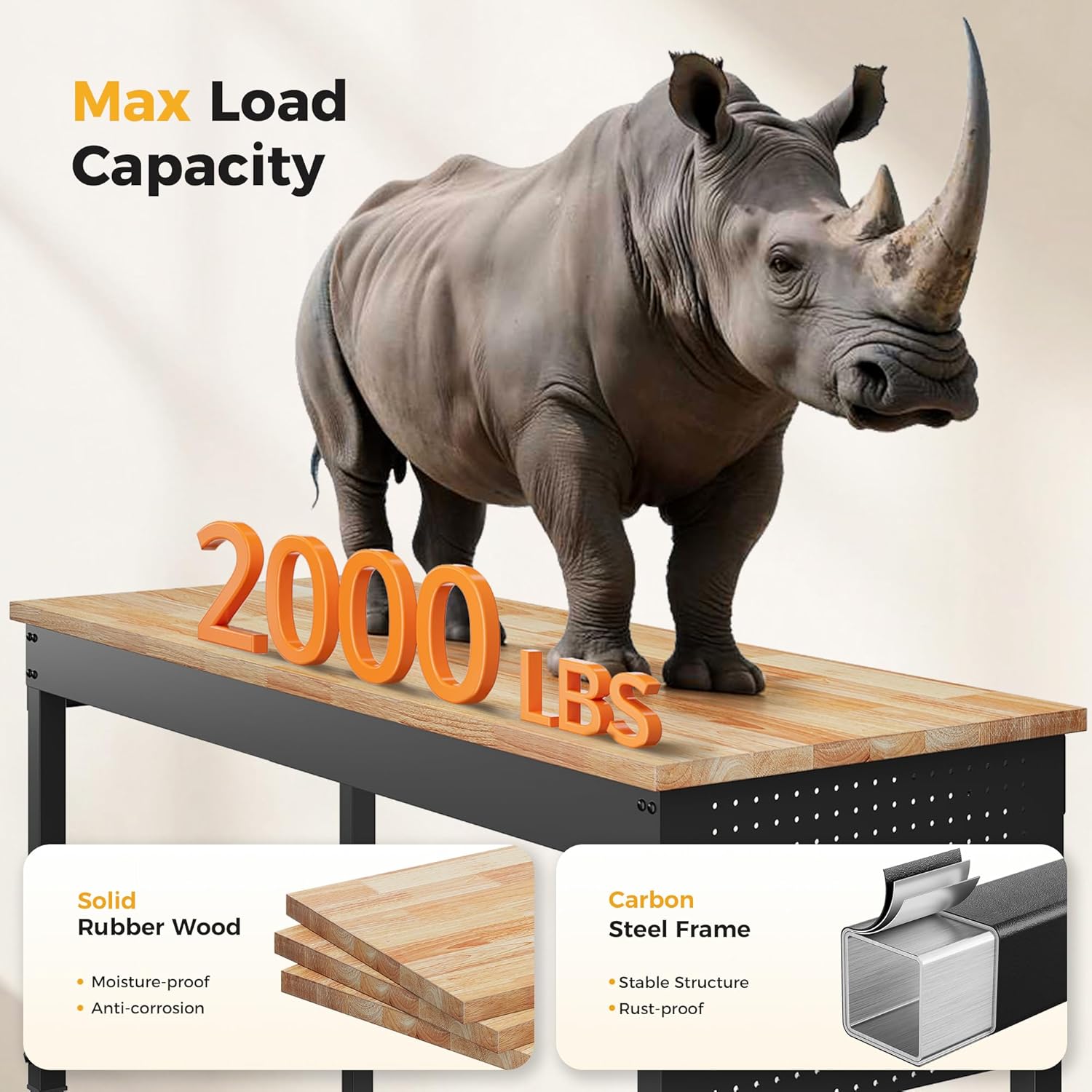 60" Adjustable Heavy Duty Workbench, 2000 LBS Load Capacity Rubber Wood Work Table with Pegboard, Power Outlets, Work Bench for Garage, Workshop, Office, Home, Commercial