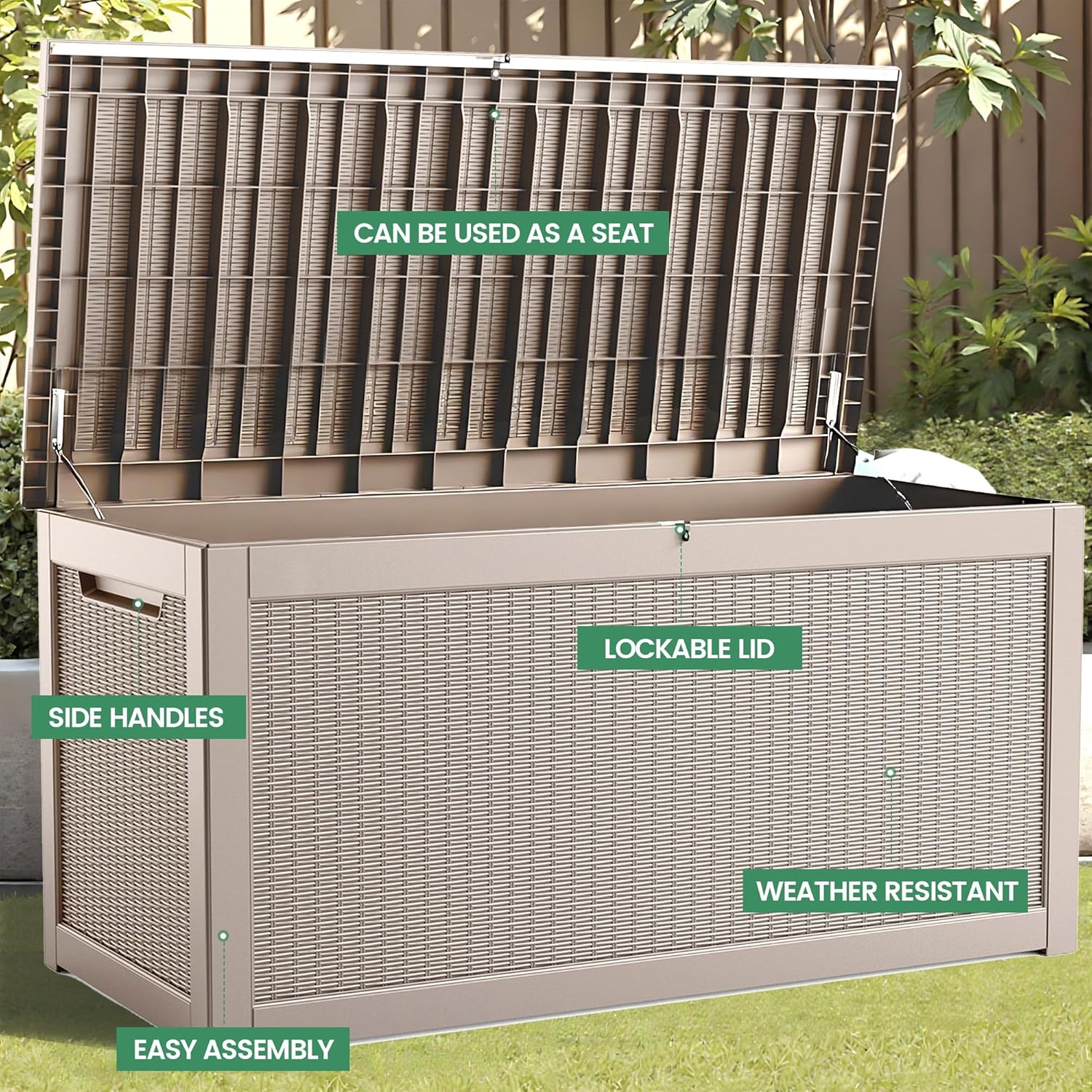 - Stylish and Practical Design:The surface has an attractive rattan effect, which is not only aesthetically pleasing but also includes a lockable lid for added security and privacy