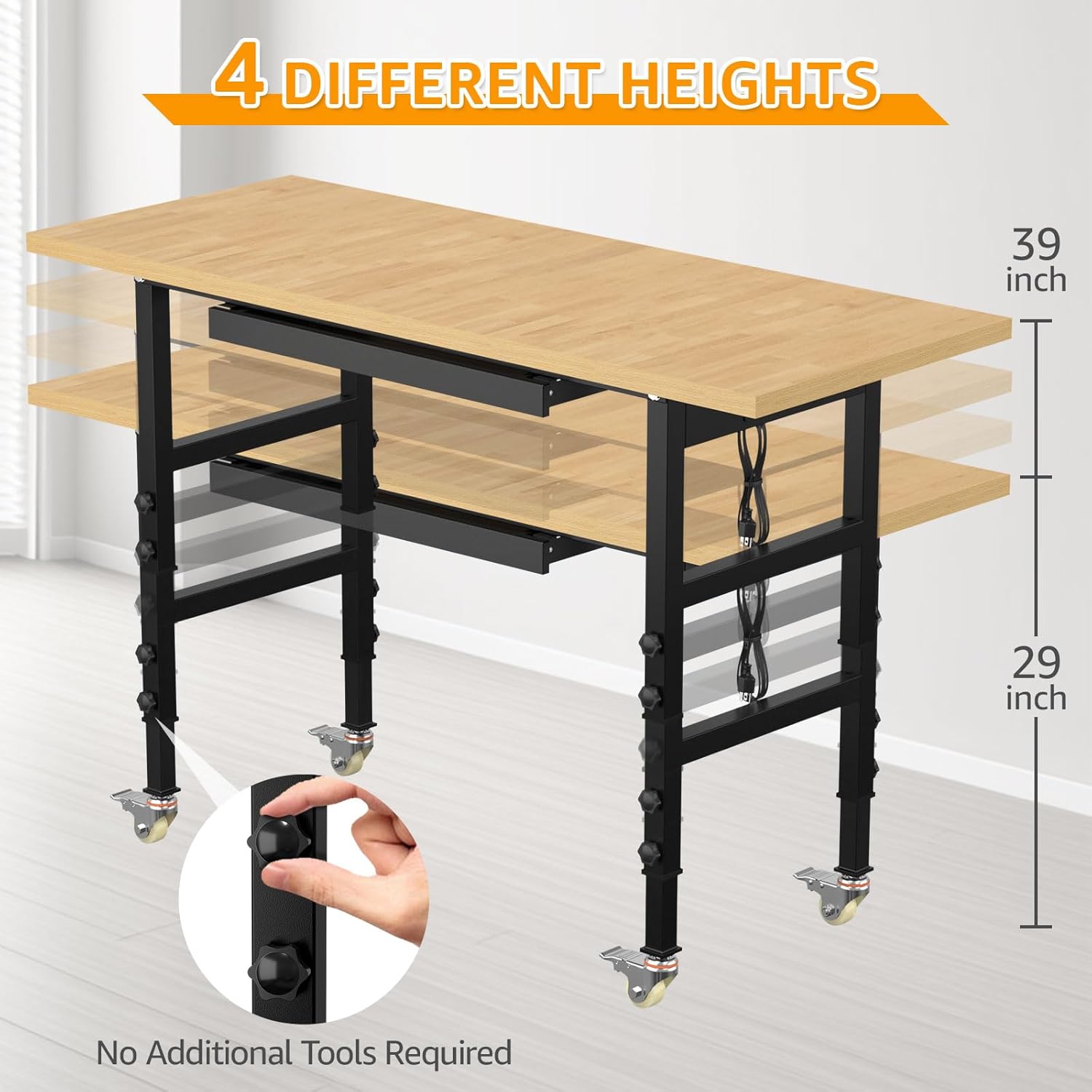 - Height Adjustable Workbench:Height adjustment ranges from 29" to 39", allowing you to use the adjustable workbench comfortably when sitting or standing.No matter how big or small you are, you can get to work effortlessly.