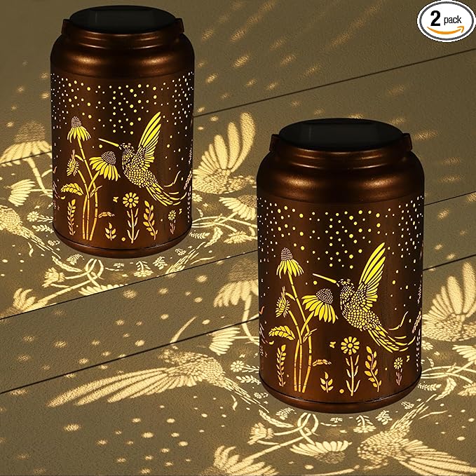 - Graceful Decorative Design:The retro appearance, with gold copper color and hollow out metal veneer, the solar outdoor lanterns casts bright and warm light in darkness, accompanied by gorgeous and graceful hummingbird patterns, adding a beautiful atmosphere to the surrounding environment.