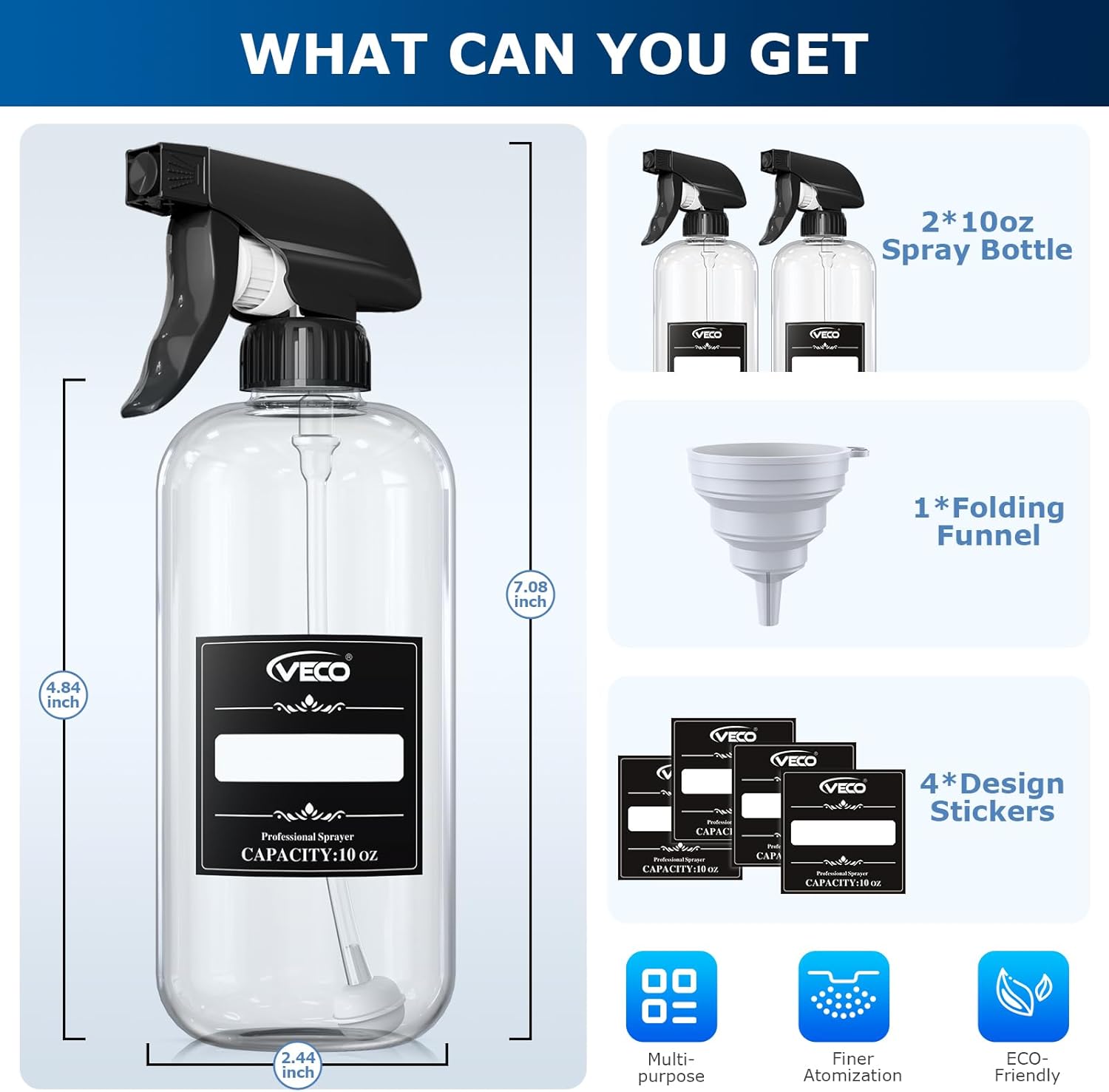 Veco 10oz Spray Bottle with Adjustable Nozzle, 360° Water Spray Bottles for Cleaning Solution, Plastic Spray Bottles for Hair Cooking Plant Pet, No Leak and Clog (2 Pack & Foldable Funnel)