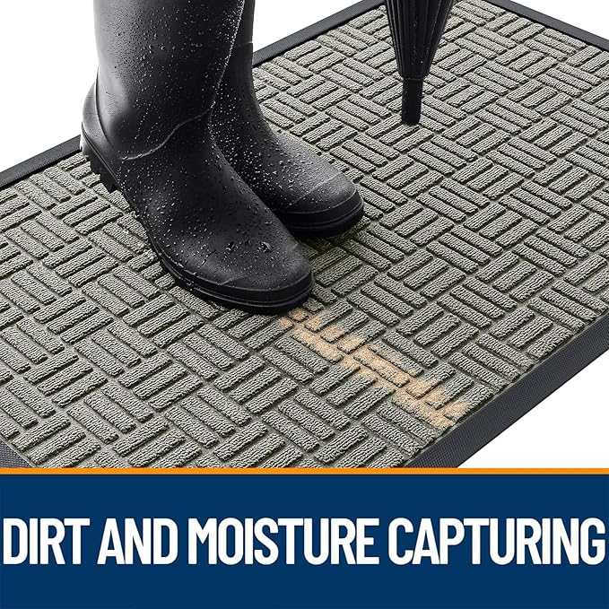 - [CAPTURES DIRT AND MOISTURE] The surface of the OLANLY door mat is made of woven polyester fabric featuring deep grooves to effectively trap dust, mud, and debris. The sturdy, beveled rubber edge prevents water pooling, ensuring a dry, clean entrance even in rainy or snowy conditions.